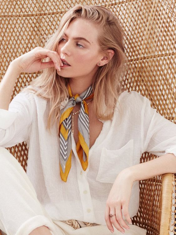 La infinita versatilidad de los pañuelos, una vez más nos demuestra sus múltiples y estilosas posibilidades. Esta primavera-verano se convierten en un complemento ideal para dar color y luz a los looks: en el cuello, en la muñeca, en el pelo o anudado delicadamente en el pasador del short o pantalón, o en el asa de la cartera.