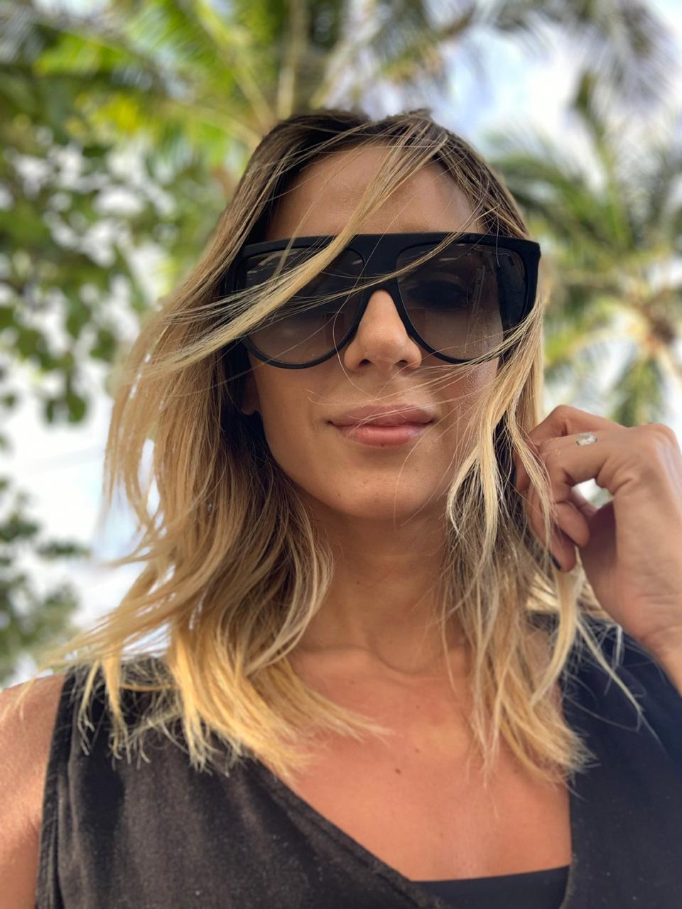 “Es el modelo más ‘osado’ de mi anteojos, y me flechó porque aporta un giro súper original a la mirada y a todo el look. Este modelo de espejos azulinos y marcos carey genera un contraste perfecto entre lo clásico (marco carey) y lo transgresor (lente espejado)”.