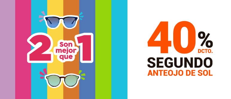 El 40% de descuento en el segundo par es una excelente ocasión para llevarte a muy buen precio de inmediato 2 anteojos de sol o bien unirte a tu mejor amiga y aprovecharlo junto a ella!