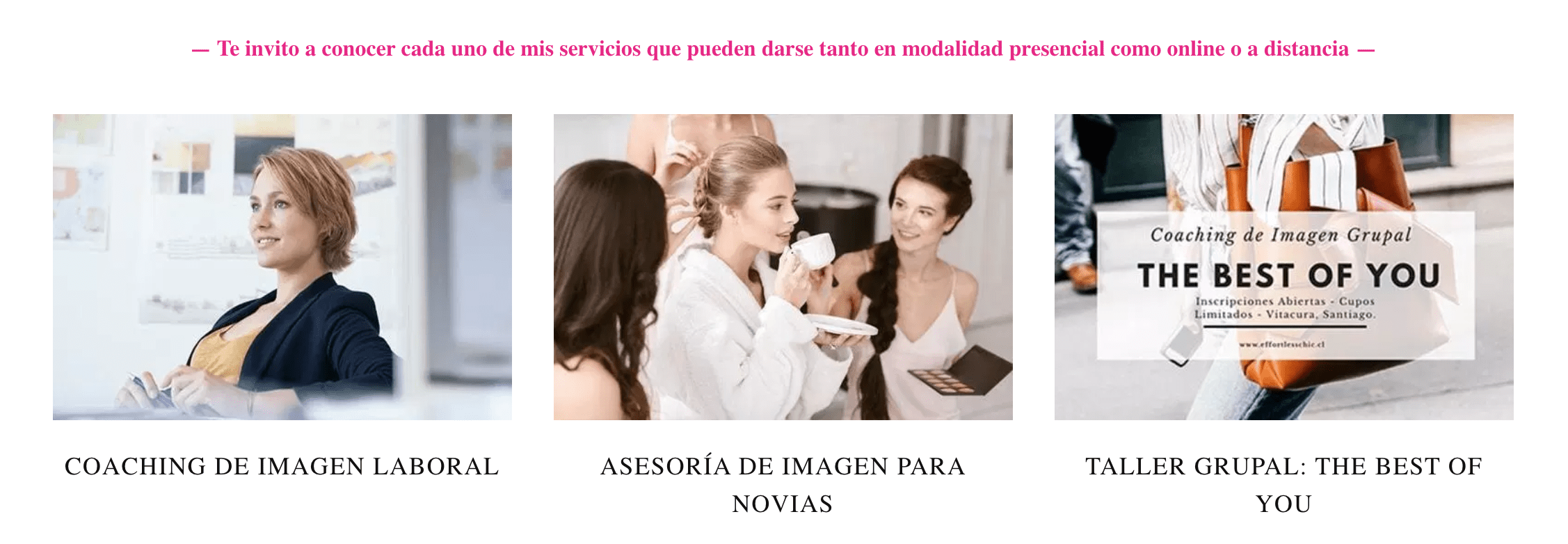 COACHING DE IMAGEN LABORAL – MARCA PERSONAL – TALLER THE BEST OF YOU – REVISIÓN DE CLÓSET – COACHING DE IMAGEN PERSONAL – PERSONAL SHOPPER – WORKSHOP DE IMAGEN PERSONAL – CHARLAS Y TALLERES EN EMPRESAS – ASESORÍA NOVIAS – ASESORÍA EMBARAZADAS
