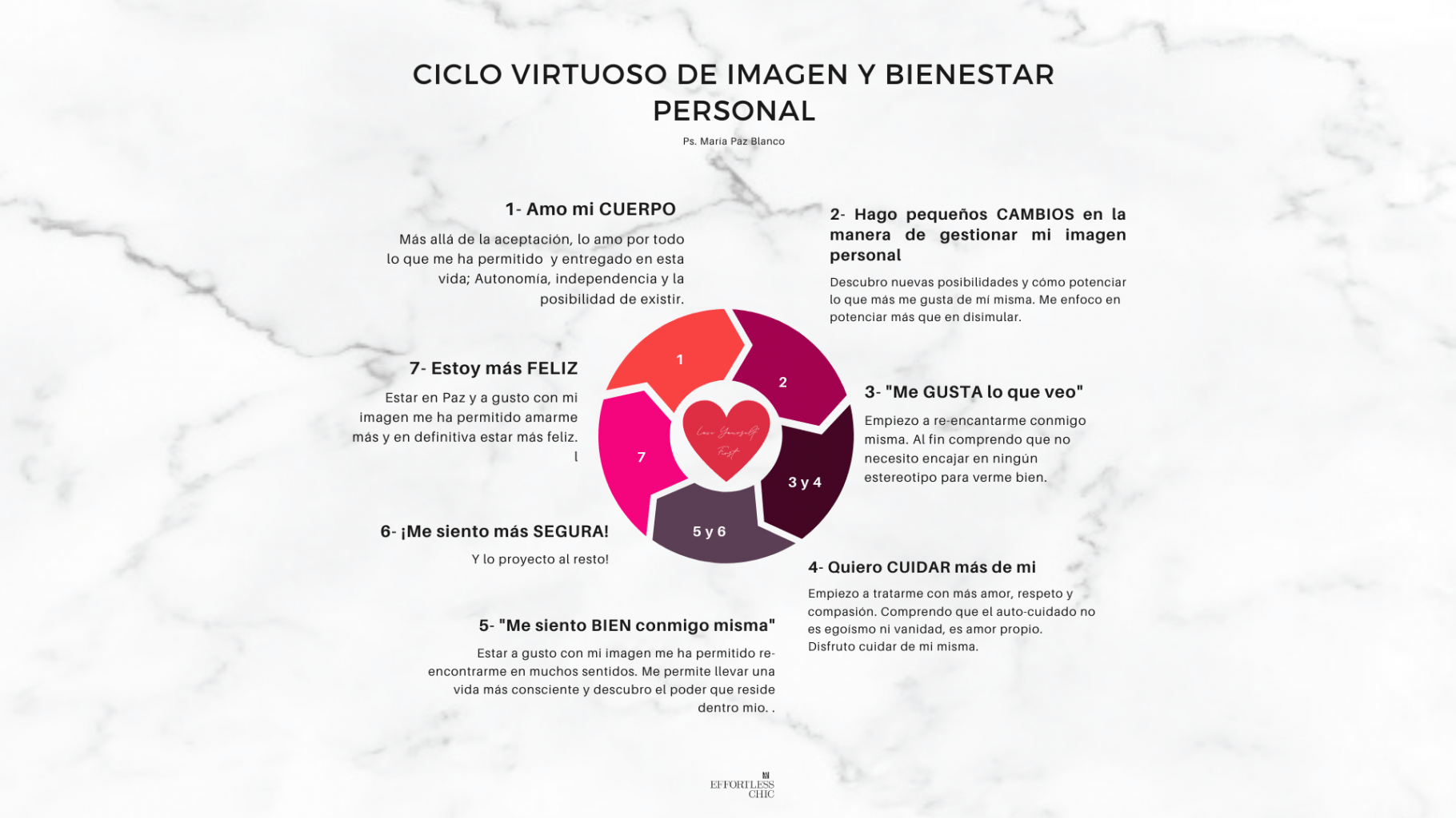 Llevo más de 6 años liderando este enfoque único en nuestro país que conjuga la Psicología con la Imagen personal y la Comunicación… Tras analizar y hacer seguimiento a los procesos y evolución de más de 500 clientas durante estos años puedo afirmar que todo proceso se basa en un ciclo virtuoso de bienestar personal.