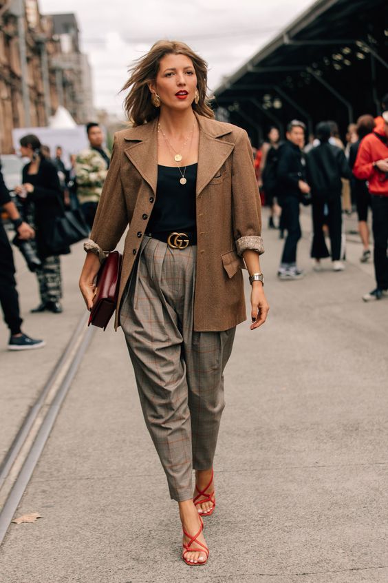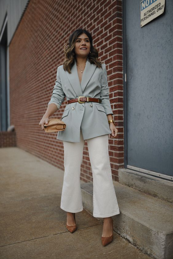 - Recoger la cintura por fuera del blazer con un cinturón es un detalle perfecto para destacar o ‘inventar’ curvas. Mucho mejor si es ancho para que adquiera protagonismo.