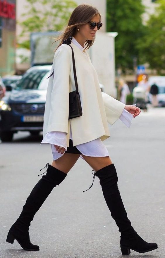 Combina tus botas sobre la rodilla con prendas más casuales de líneas oversize para ‘aterrizar’ la formalidad innata de este calzado.
