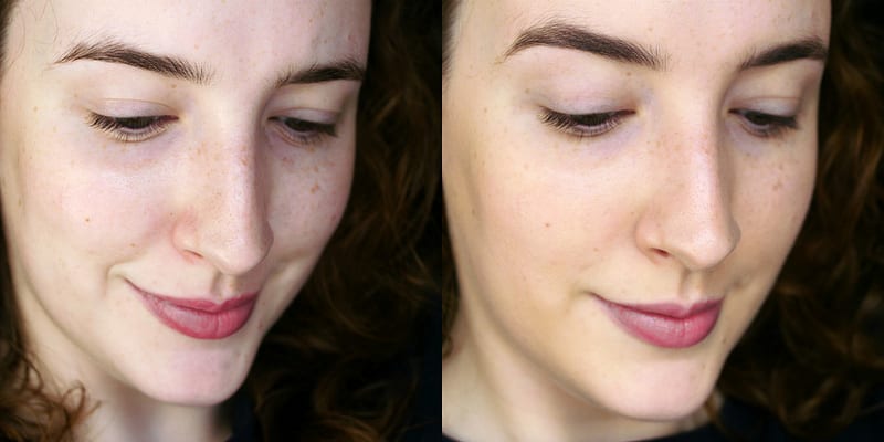 Algo que me encanta es que cubre muy bien manchas e imperfecciones pero sin la sensación de llevar una máscara puesta. Si se fijan, las “rojeces” disminuyen bastante, el tono luce más parejo y prevalece un look natural. Las pequitas aún se ven, pero si se fijan bien la tez luce más pareja.