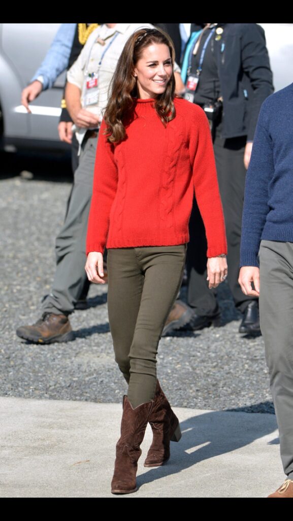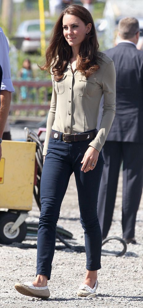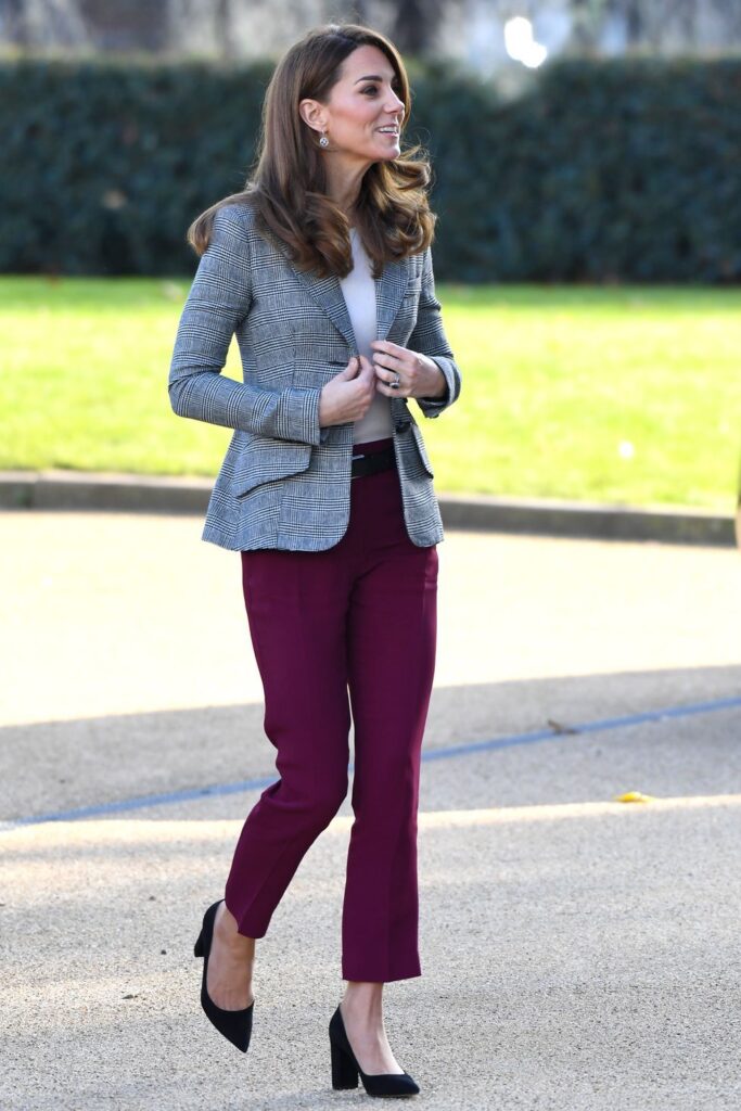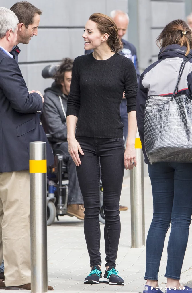 Algo que nos encanta de la Duquesa de Cambridge es que no teme en usar las mismas prendas una y otra vez, aquí vemos como unos pantalones culotte en color azul marino los lleva en clave sport con zapatillas y un top a rayas y luego con tacones, un sweater marinero y un clutch en rojo que da ese sello perfecto.