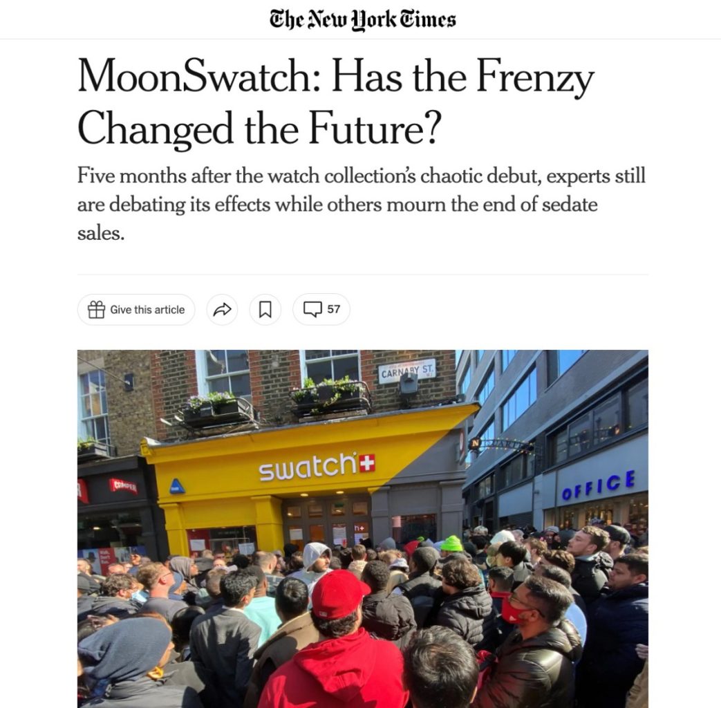 De Japón a Francia, pasando por Australia, colas interminables se han formado a las puertas de las tiendas Swatch donde se ponía a la venta. Algunos incluso pasaban la noche al raso para no perder su turno, tal y como han documentado las redes sociales y los medios de comunicación. A primera vista, demasiado ajetreo por un reloj. Pero, a poco que se profundice, lo que emerge es un fenómeno sin precedentes: una alianza entre dos relojeras complementarias que refleja como pocas el momento que vivimos. Y una nueva forma de entender la relación entre la relojería de lujo y la dirigida a públicos más amplios. (Fuente: El País)