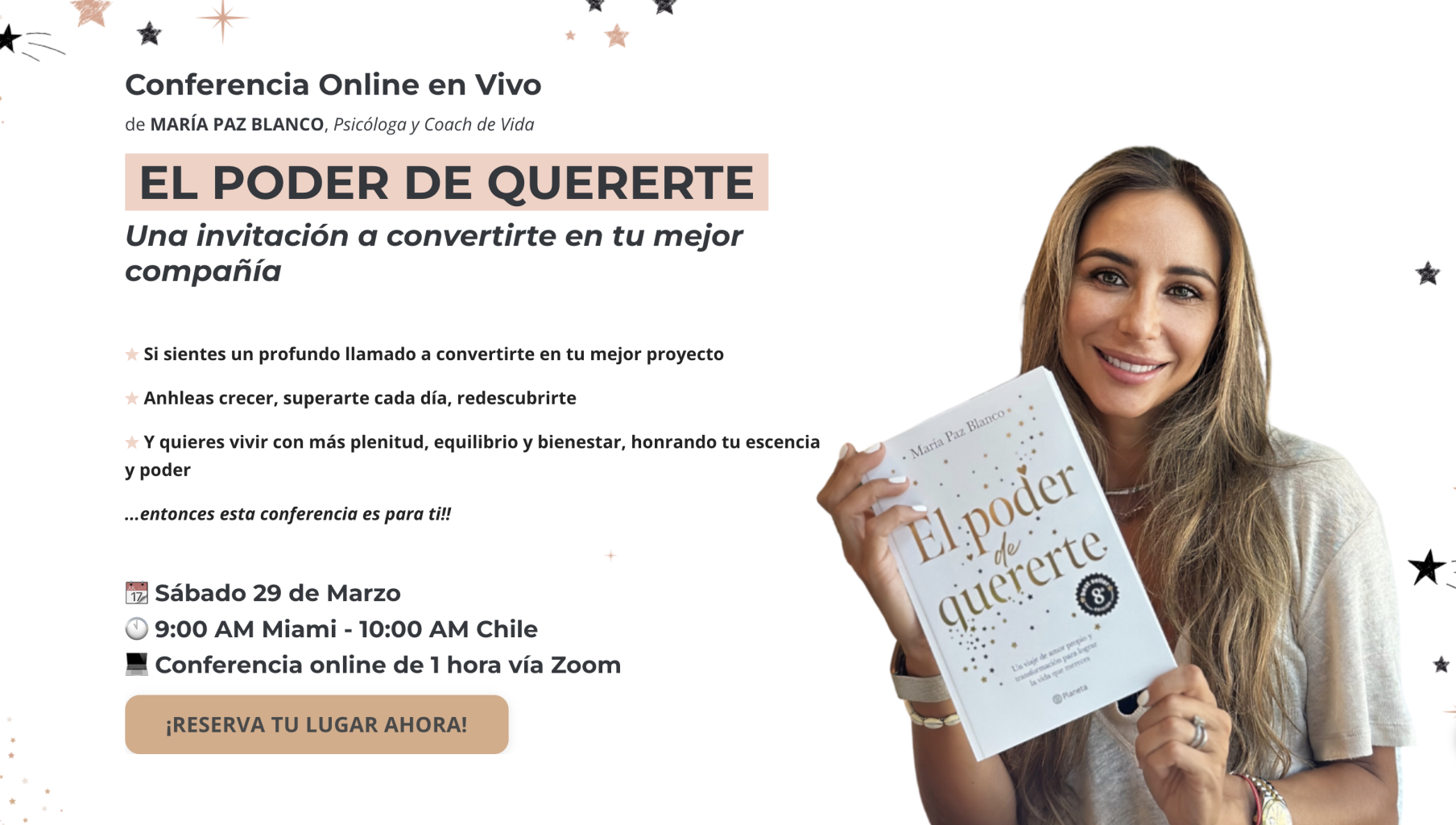 El sábado 29 de marzo a las 9:00 AM (hora Miami) / 10:00 AM (hora Chile), a través de Zoom, en vivo, y con la grabación disponible durante 30 días para que puedas verla cuando quieras, tantas veces como desees, a tu propio ritmo y horario. Si no puedes conectarte en ese horario, no hay problema.