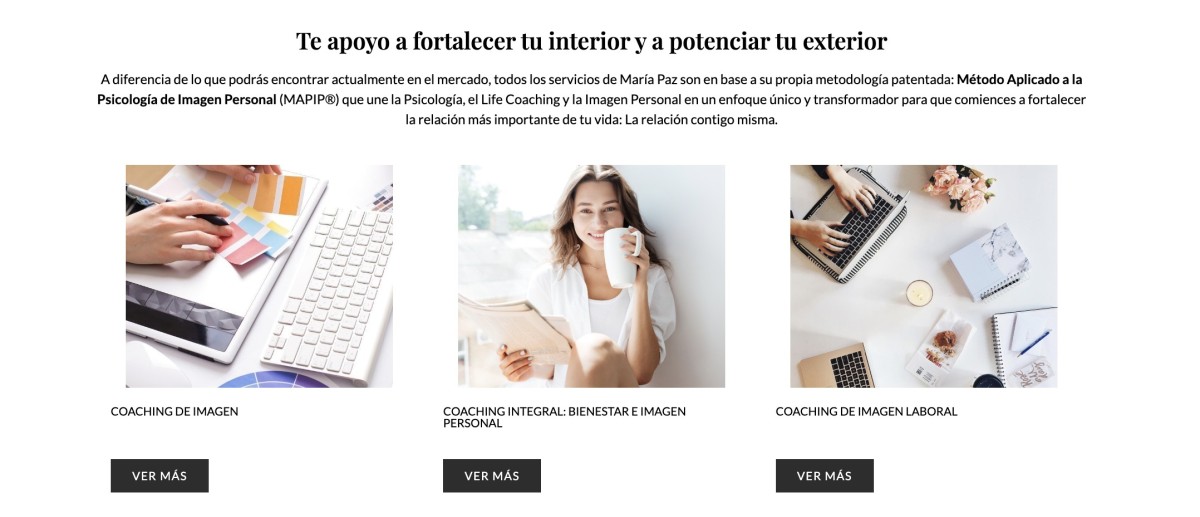 Son miles las mujeres que han transformado sus vidas a través de mis servicios, y la satisfacción está garantizada. Descubre la metodología exclusiva y patentada de María Paz Blanco: el Método Aplicado a la Psicología de Imagen Personal (MAPIP)®, una herramienta poderosa que no solo realza lo mejor de tu imagen, sino que te permite disfrutar de un estilo auténtico que te haga sentir radiante, cómoda y segura. Con este enfoque, cada mañana será una nueva oportunidad para amarte y vestirte con confianza, invitándote a aceptarte, empoderarte y quererte más que nunca. ¡Este es tu momento para brillar y transformar tu vida desde adentro hacia afuera!