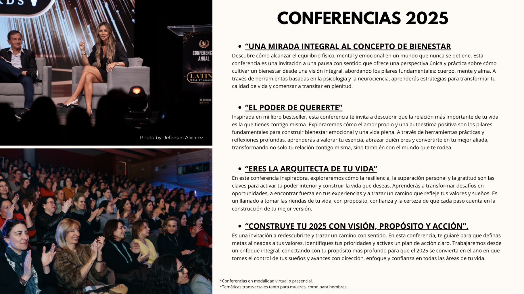 Desde hace años, María Paz Blanco, Psicóloga, Life Coach y Conferencista, ha liderado transformaciones significativas a través de charlas diseñadas para inspirar y empoderar a los equipos de trabajo. Su enfoque va más allá de la igualdad de género: se centra en el fortalecimiento integral, ayudando a las mujeres a reconectar consigo mismas mediante el amor propio, la resiliencia y el desarrollo de su poder personal. Además, sus conferencias abordan temáticas transversales, convirtiéndose en espacios ideales para fomentar la unión, el compromiso y el crecimiento colectivo dentro de toda la organización.