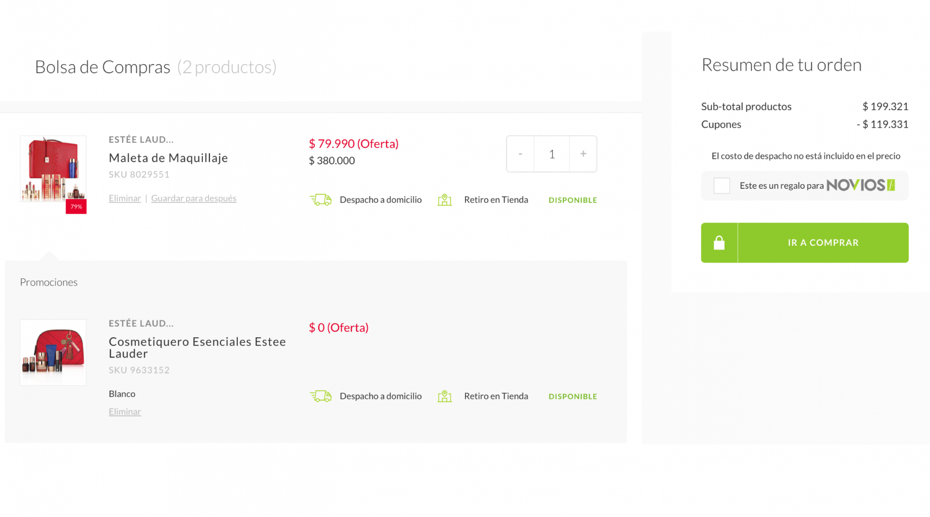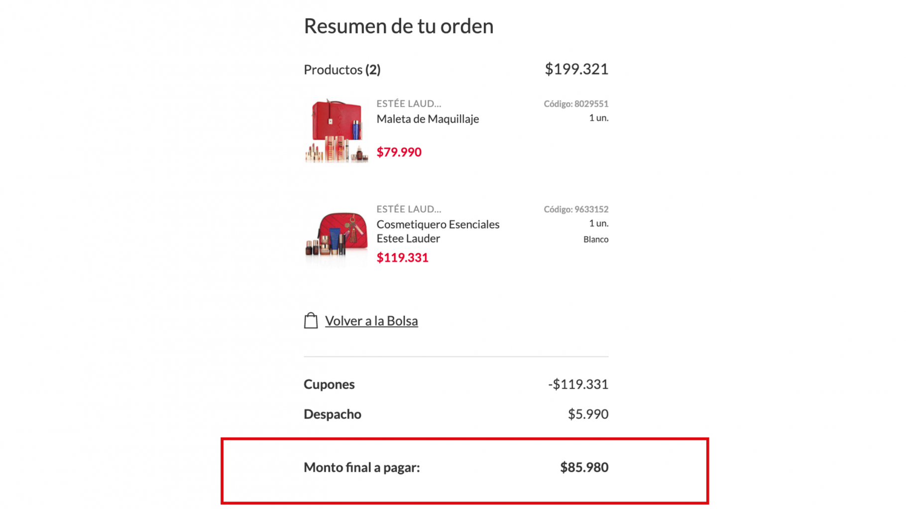 Primero que todo. La increíble maleta Estée Lauder está al maravilloso precio oferta de $79.990. Esto es un 79% de descuento a su valor original que es de $380.000.