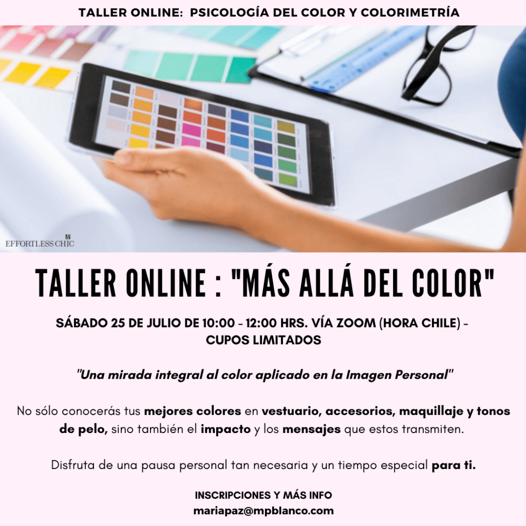 “Más allá del color” que ya va en la segunda edición, es un taller grupal online que te entregará todas las herramientas para que puedas elegir con éxito los mejores colores para ti en temas aplicados a vestuario, accesorios, maquillaje y tonos de pelo.