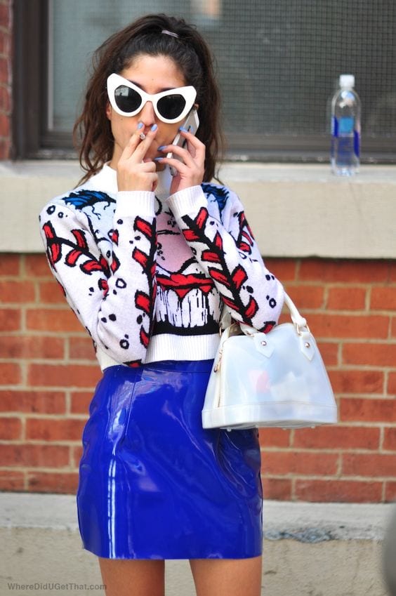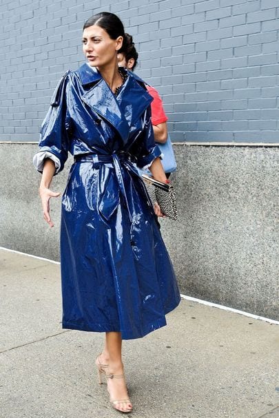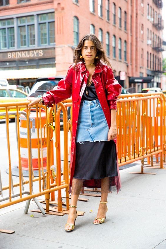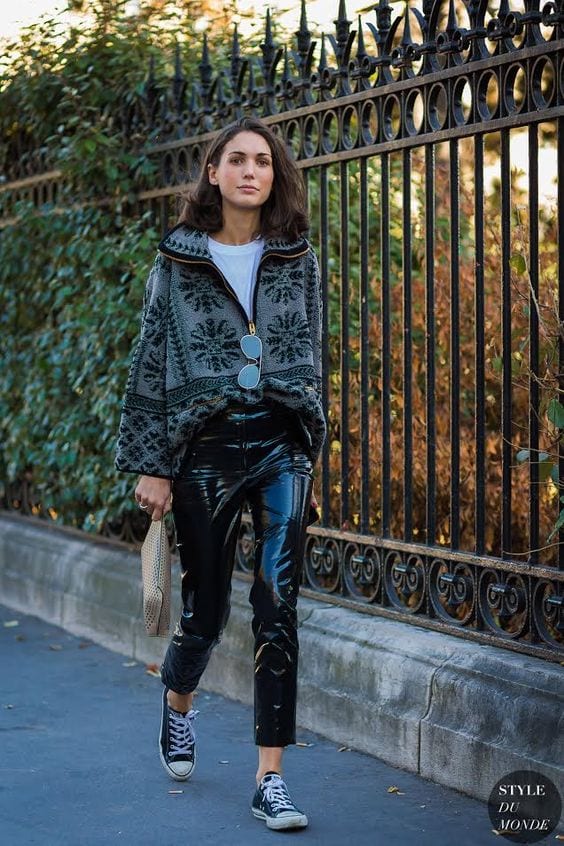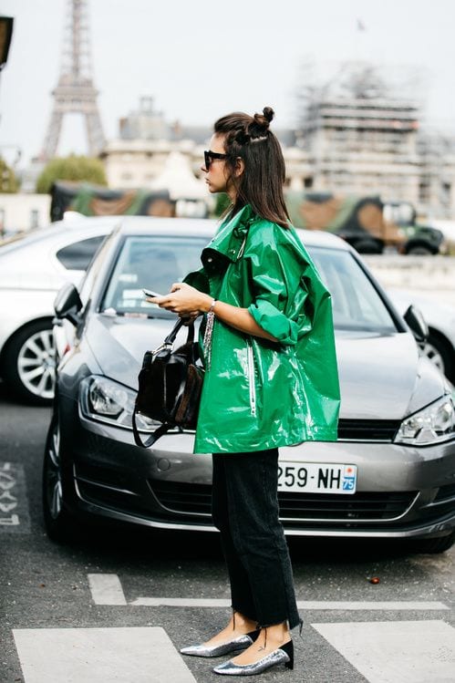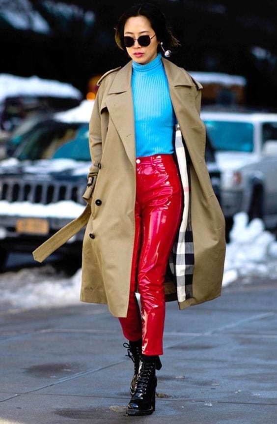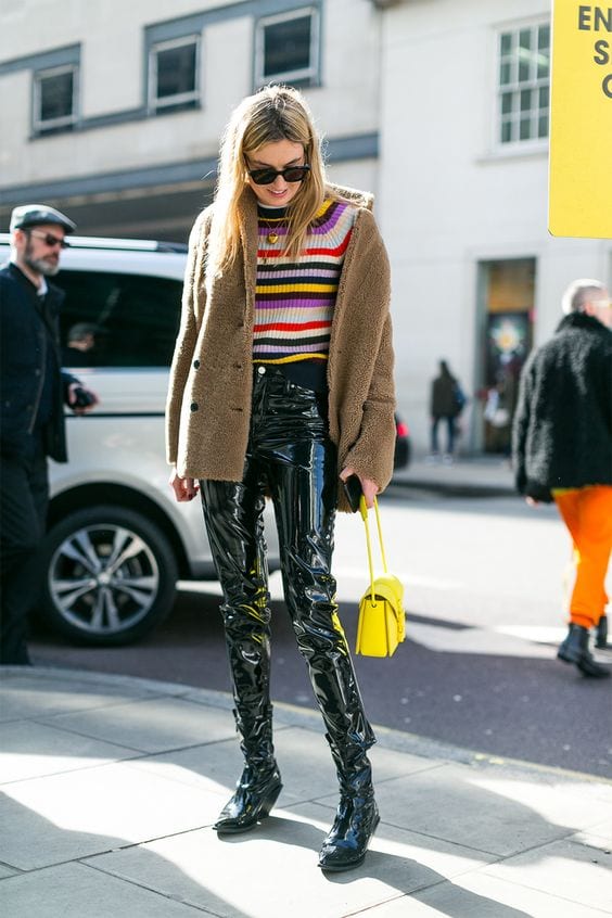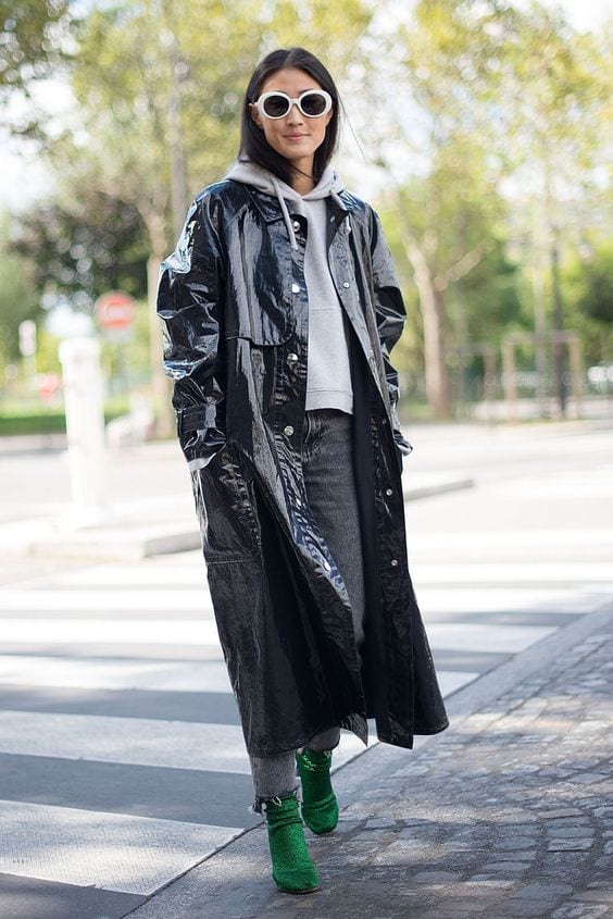 Quizás la forma más fácil de llevar la tendencia del vinilo es a través de prendas como chaquetas. Úsalas abiertas para estilizar la figura y no tengas miedo de experimentar con colores más atrevidos. Eso sí, no recargues el outfit. Que la prenda que llame la atención sea solo el abrigo o chaqueta, abajo usar unos jeans está perfecto!