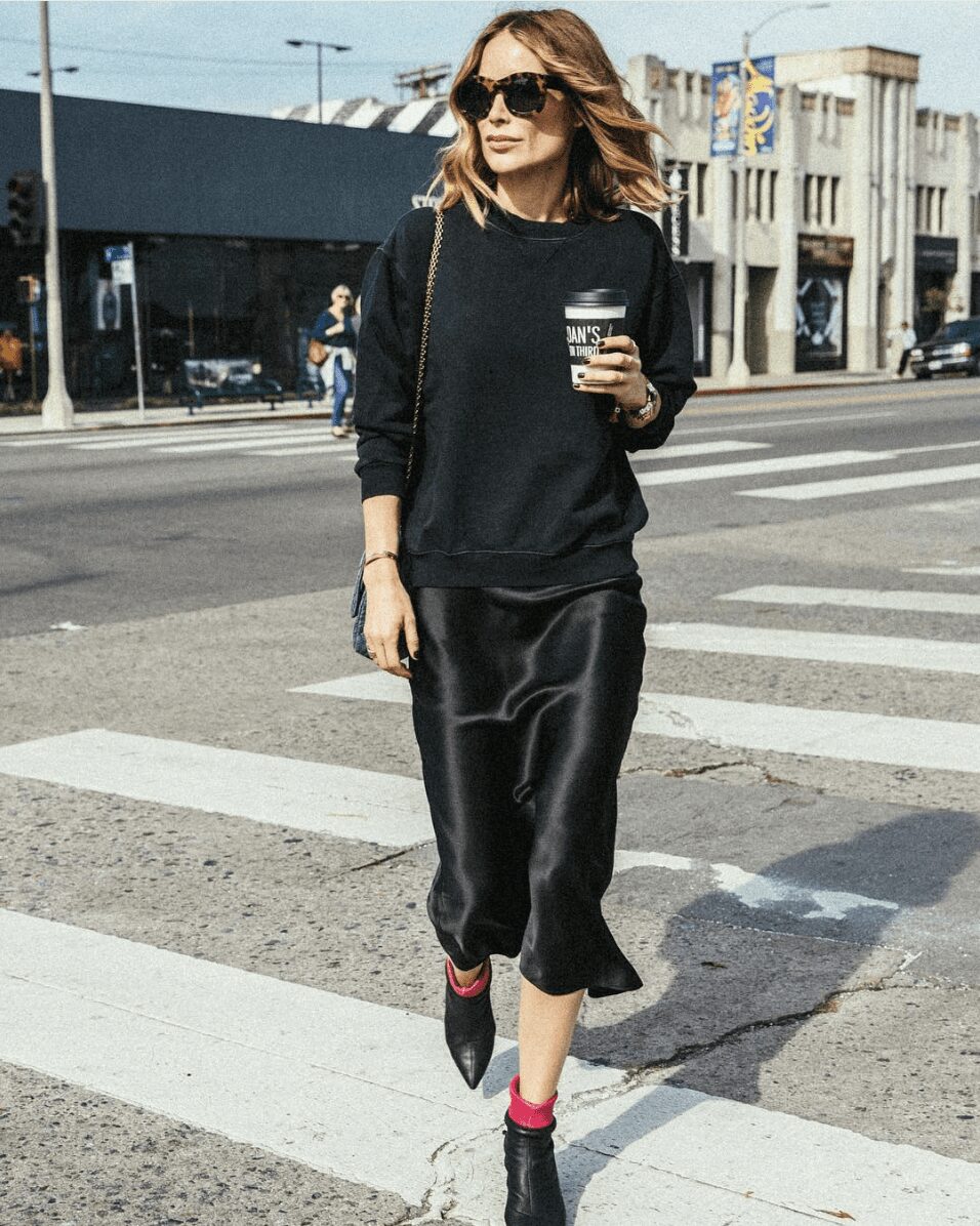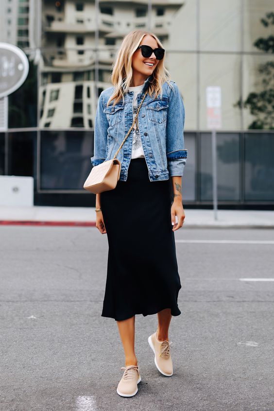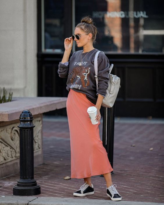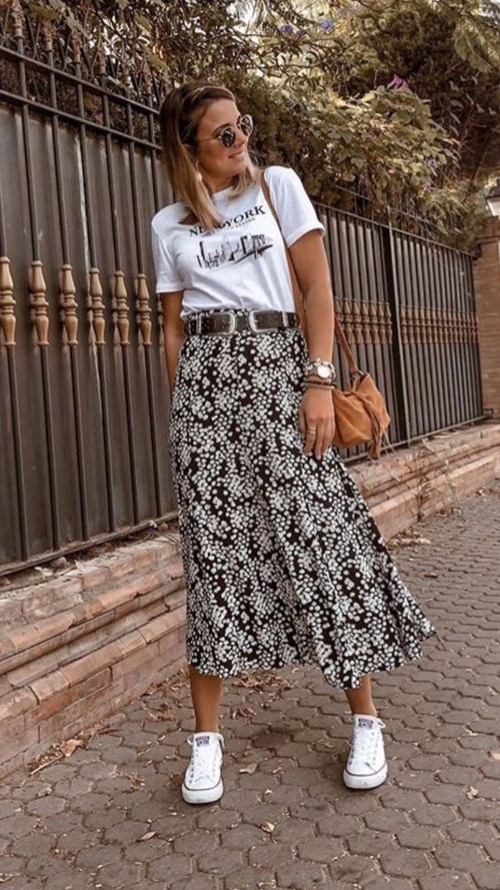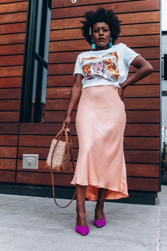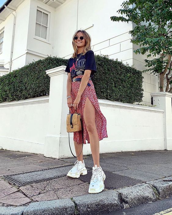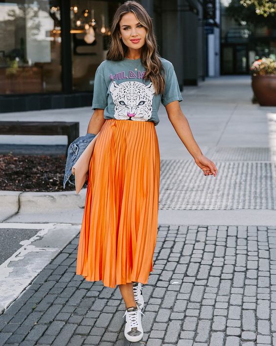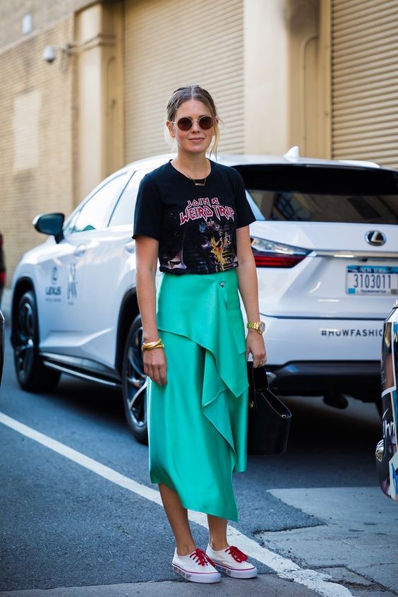 El dúo de la falda midi + polera estampada con algún mensaje o motivo roquero, es un combo que genera un atractivo contraste.