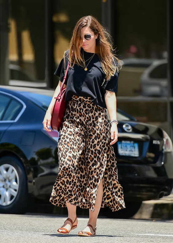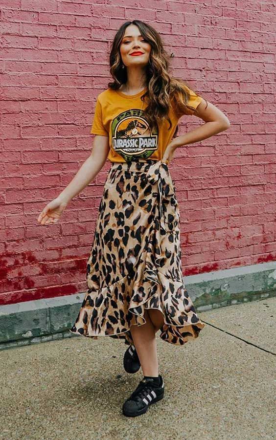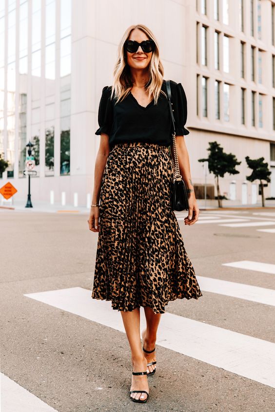 El estampado animal es un print que no pasa de moda, y que se ve increíble en una falda midi, ya sea plisada o lisa. Combínala con un top básico y liso, para conseguir un equilibrio en la intensidad de esta prenda.