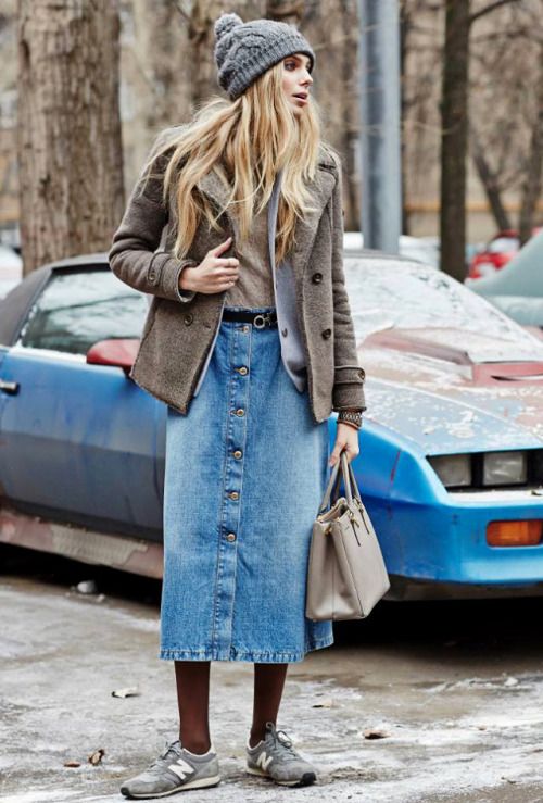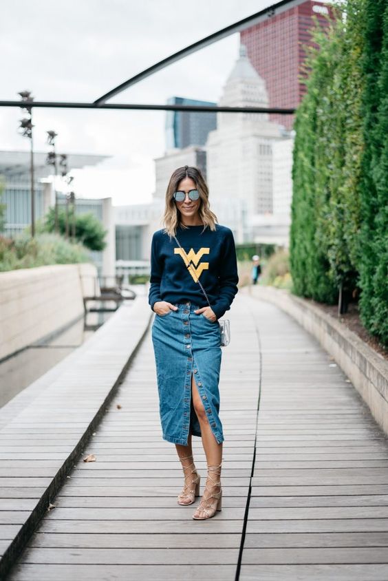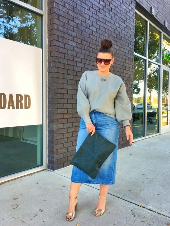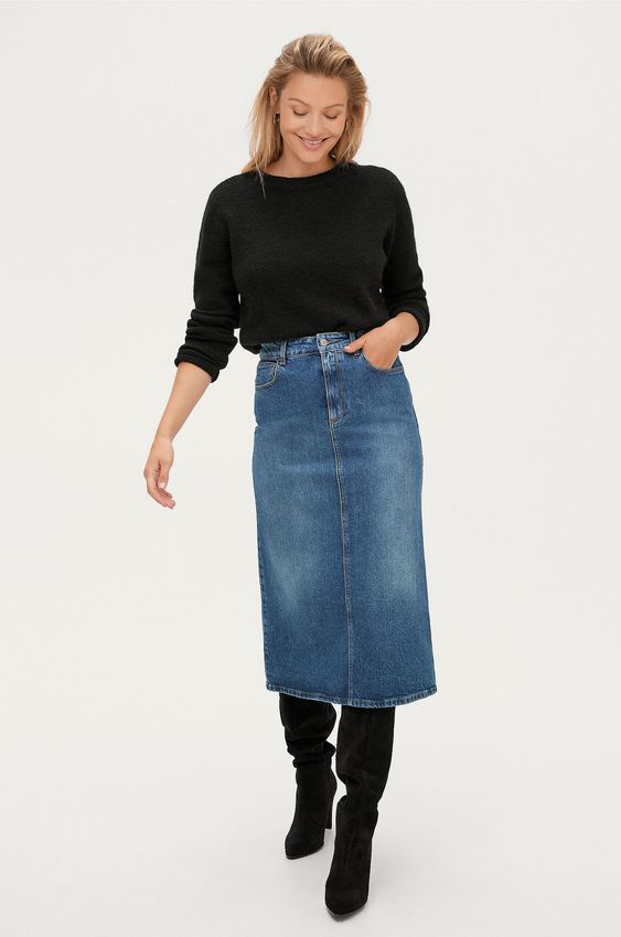Los sweaters otoñales también son una prenda perfecta para acompañar tu falda midi de jeans. Mucho mejor si los llevas recogidos por dentro de la cintura, para crear curvas en tu silueta y darle armonía a todo el look.