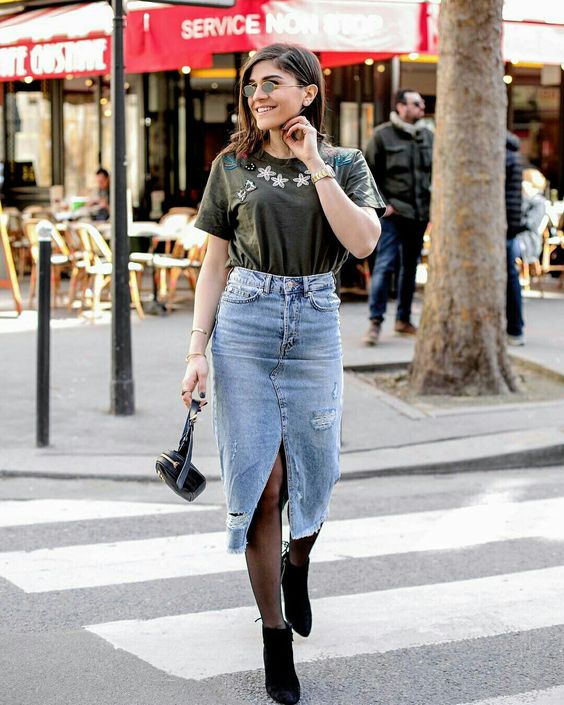Una opción súper cómoda y estilosa para combinar tu falda midi de jeans, es llevarla con una biker o chaqueta negra, y unos botines de tacón o zapatillas urbanas. ¿Qué te parecen estos looks?