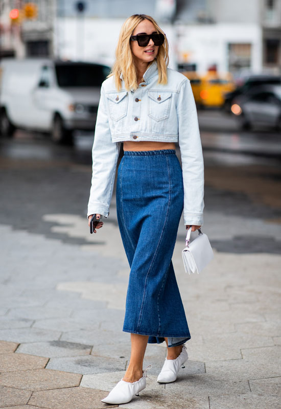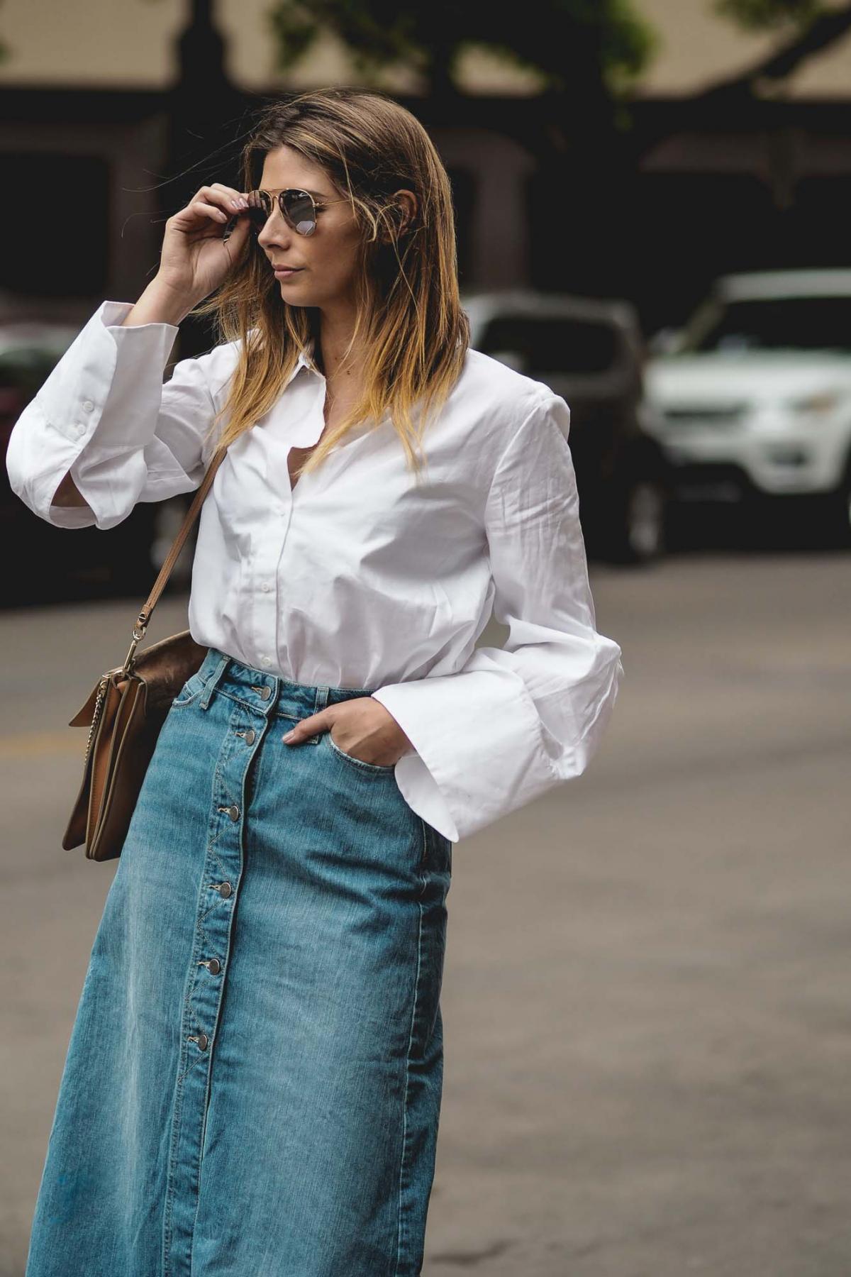 Las mangas globo son un hit para darle movimiento a tu look en contraposición con las líneas rectas de la falda midi de jeans.