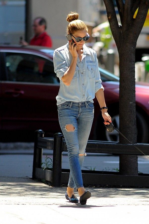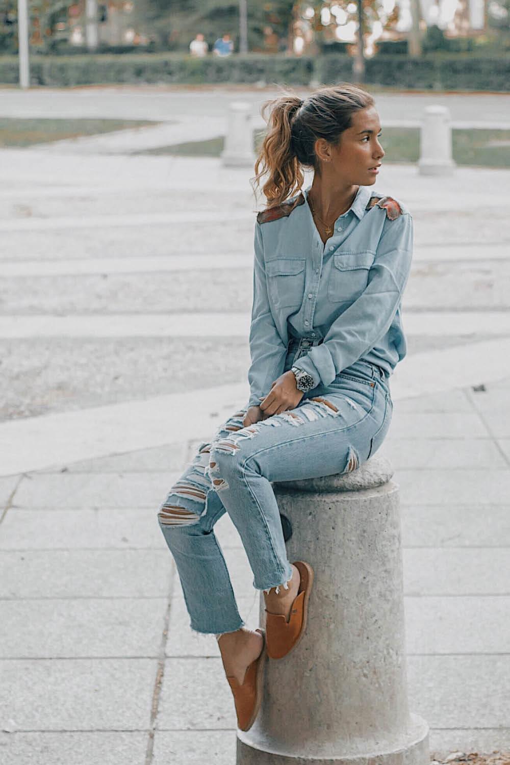 Llevar jeans rasgados con una camiseta o chaqueta de denim es un combo que queda increíble. Mucho mejor si optas por dos tonos de mezclilla diferentes, así se genera un quiebre entre ambas prendas.