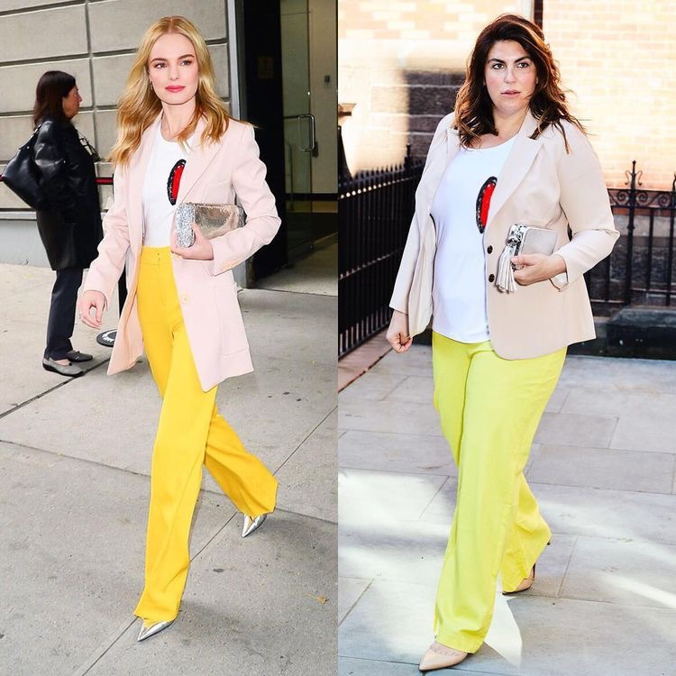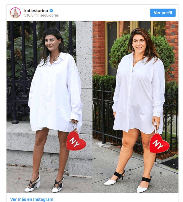 Katie Sturino hoy ya está todo un referente en lo que respecta a estilo y moda en mujeres de tallas más grandes. Hace ya un tiempo se dio a conocer en Instagram por sus recreaciones de fotos de infinidad de famosos bajo el hashtag #SuperSizeTheLook recreando sus outfits en su propio cuerpo y mostrando al mundo entero que no se trata netamente de un “tema de peso”, sino de actitud y amor propio.