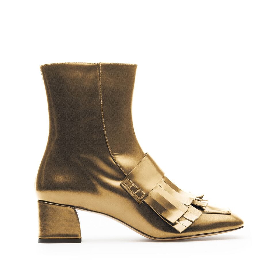 La familia Gold Fringes es, sin duda, la más imponente de la línea New Retro. Tanto el botín dorado Lola con tacón grueso de altura media como el mocasín Ezel son la apuesta segura para las que quieran conseguir el auténtico look 60’s.