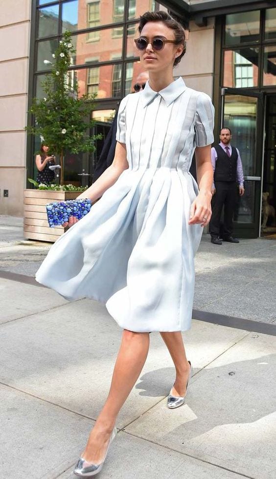 Celeste + plateado. ¡No falla! Es sobrio, elegante y dulce a la vez. Es una mezcla de tonos fríos que favorece a rubias y morenas. Puedes incorporar el plateado en zapatos, una cartera o si te atreves, jugar con una falda o un pantalón. El único cuidado que deberías tener es si tienes piernas y caderas anchas, fíjate en las formas de la prenda en plateado (prefiere una falda en forma ‘A’, por ejemplo) o lleva el plateado en el top.