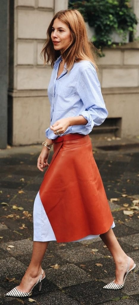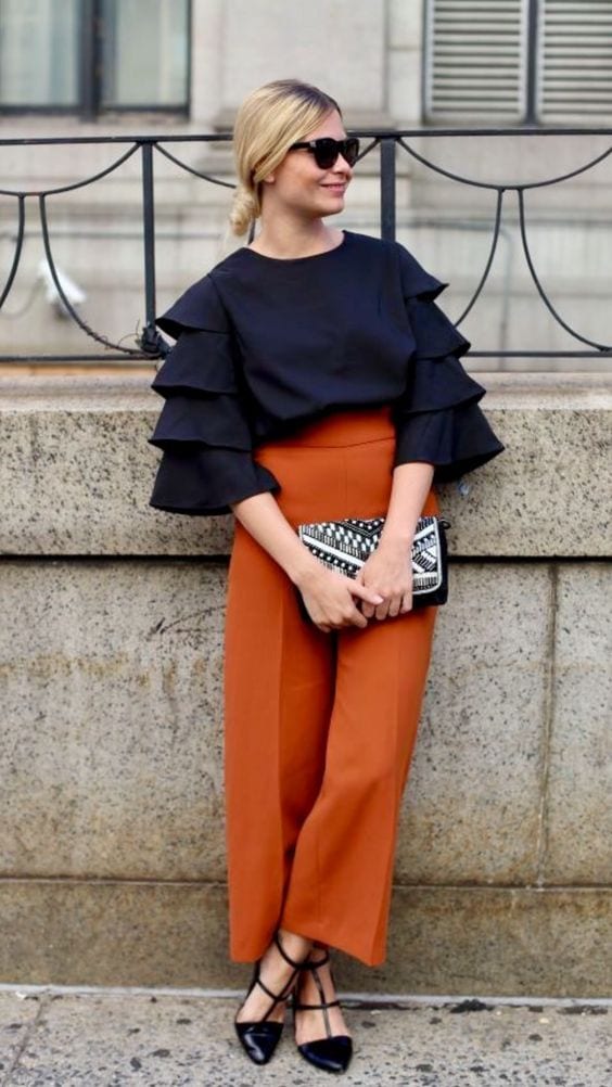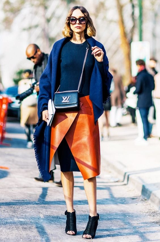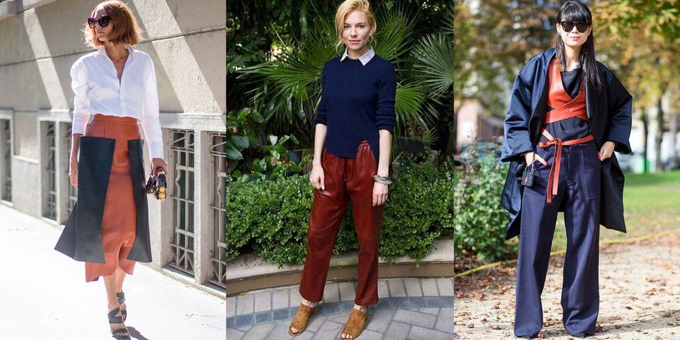 Terracota + azul marino. Clásico, elegante y sobrio. Le queda bien a todo el mundo y es apto para todas las ocasiones. Es una excelente combinación para entrar en el otoño. Para quitarle formalidad puedes jugar mezclando capaz y texturas; una falda de seda con una camiseta de algodón, un pantalón palazzo y una chaqueta denim… Suelta tu imaginación y atrévete a armar outfits diferentes.