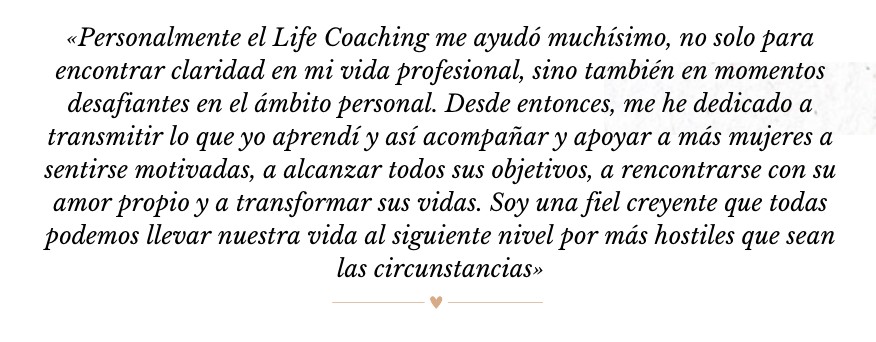 A través de estas sesiones de Coaching de Vida «uno a uno» junto a mí, quiero brindarte ese espacio seguro y las herramientas necesarias para que comiences a conectar o re-conectar contigo misma, con tus sueños, tus objetivos, tu poder personal y empieces a ser la maestra y arquitecta de tu vida. Porque sí, nuestra realidad actual, muchas veces es reflejo de nuestro mundo interior.