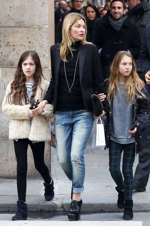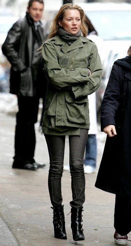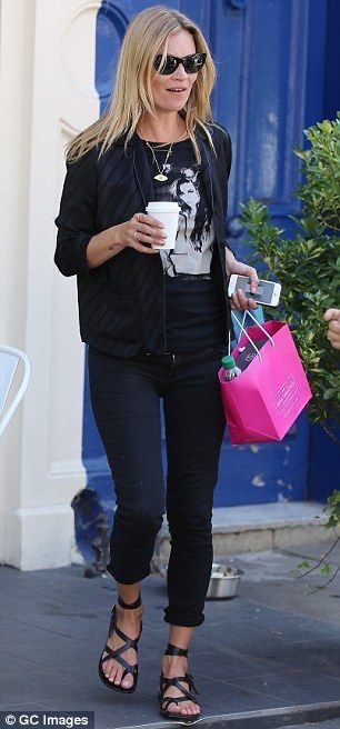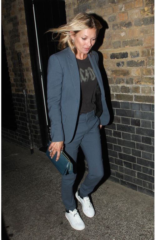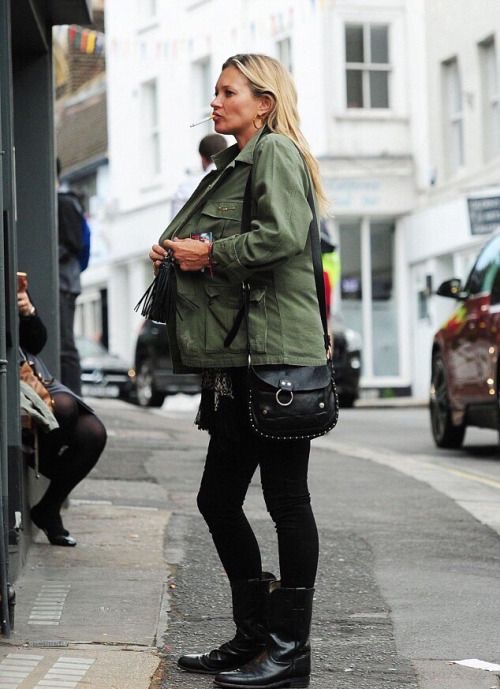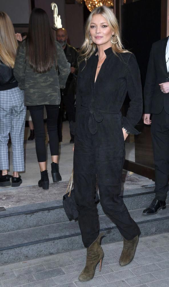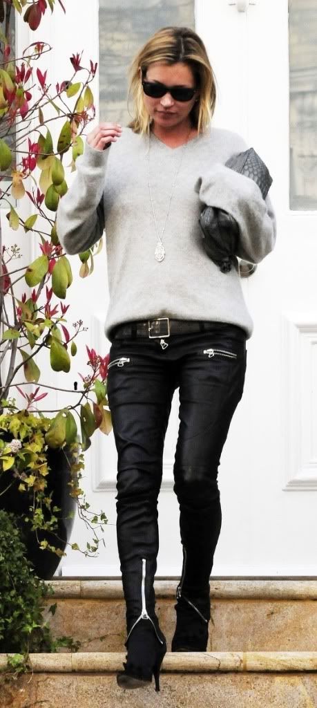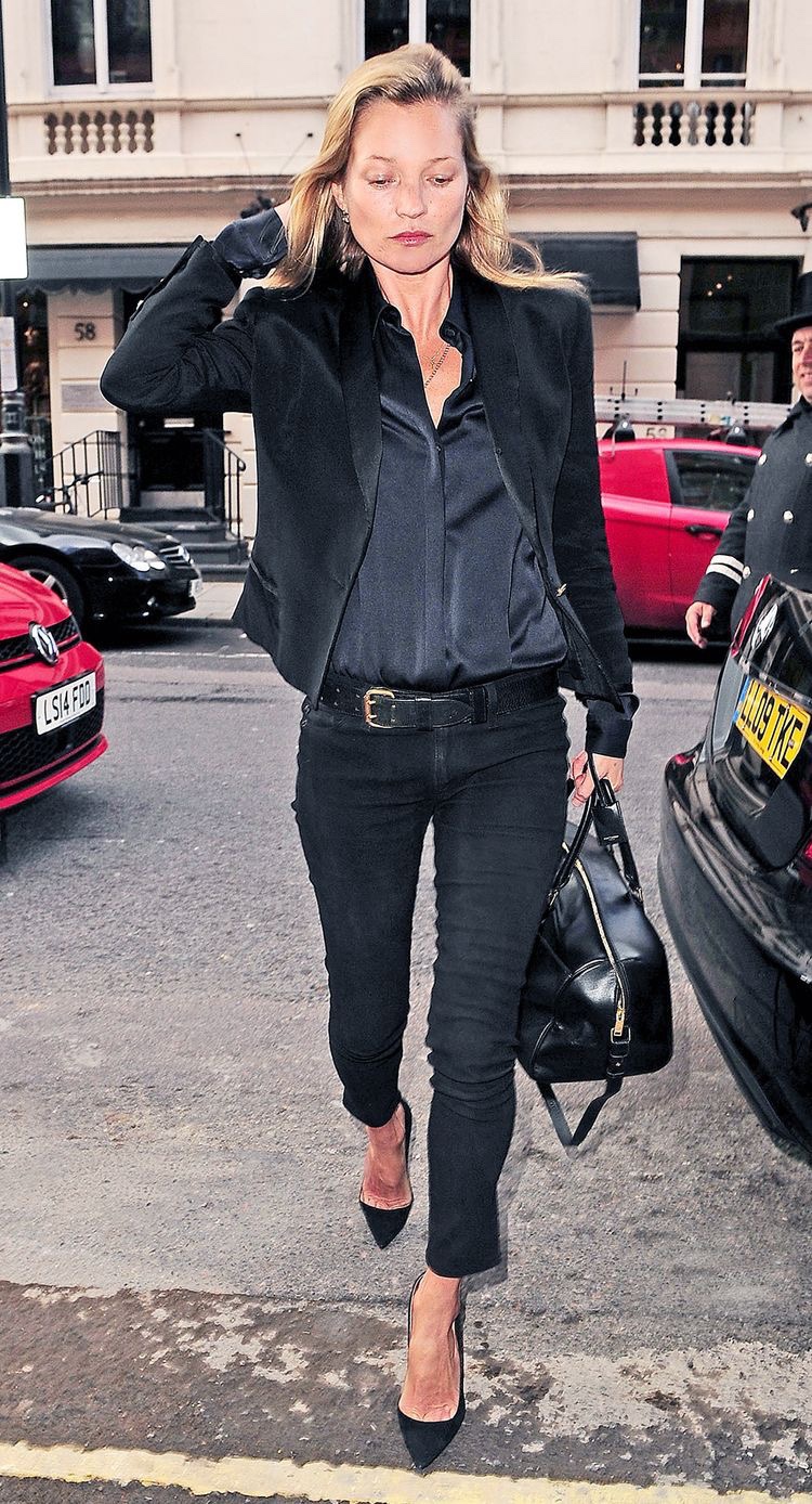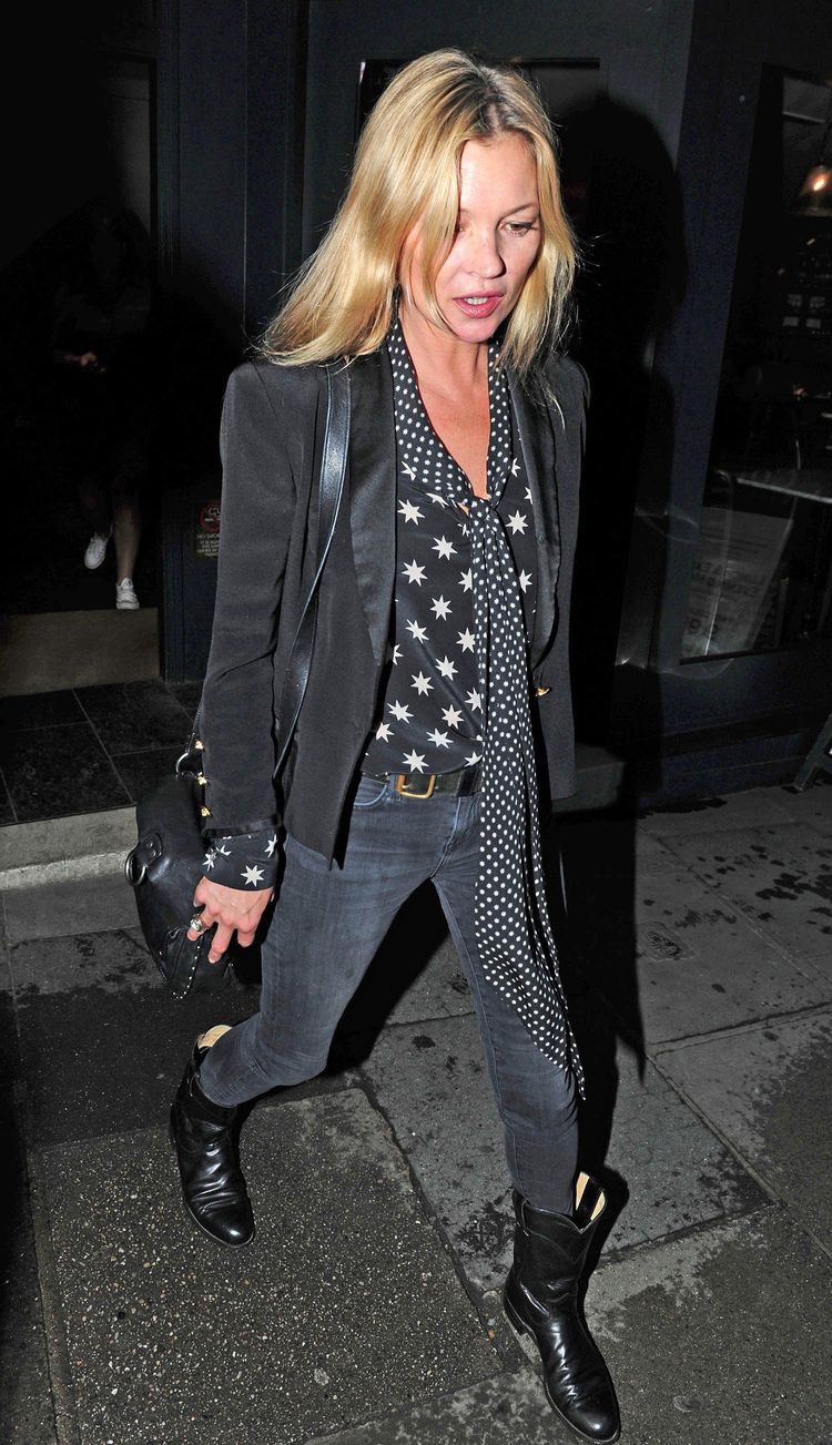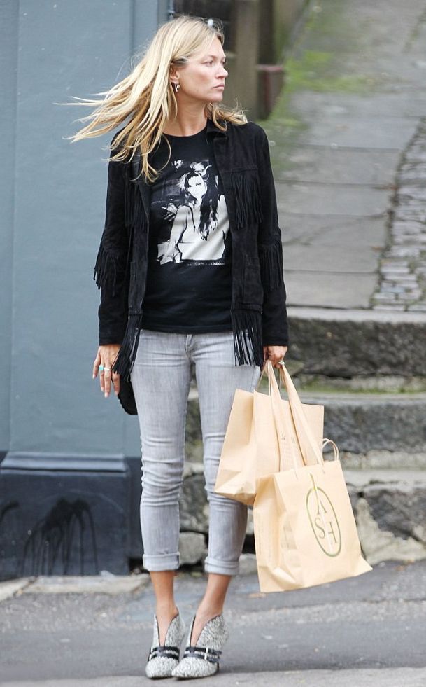 Si se fijan la paleta de Kate Moss es bastante neutra: Gris, negro, azul marino, beige, blanco y mucho, pero mucho denim, cuero y pieles. Nunca la verás con colores fuertes para el día a día.