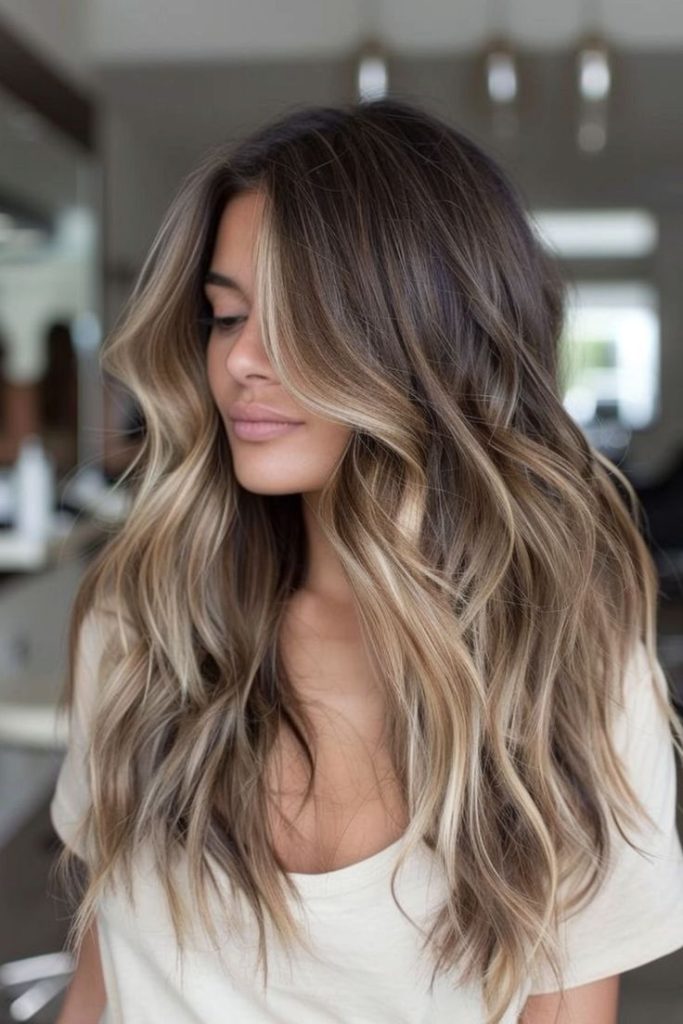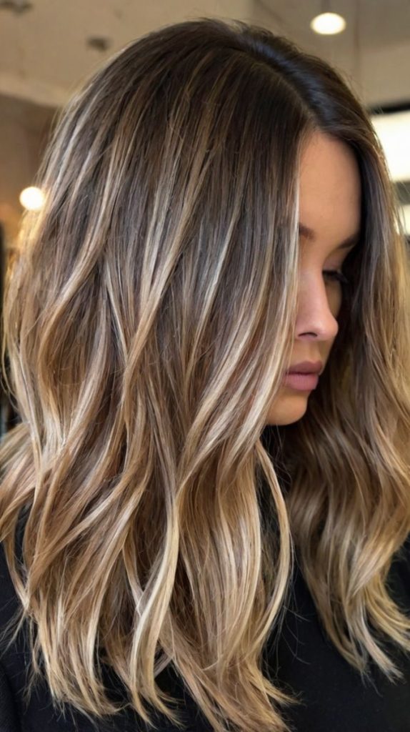 Para quienes prefieren tonos más fríos, el balayage en marrón ceniza es una apuesta moderna y sofisticada. Este estilo combina raíces oscuras con reflejos fríos que generan un efecto de profundidad y movimiento.