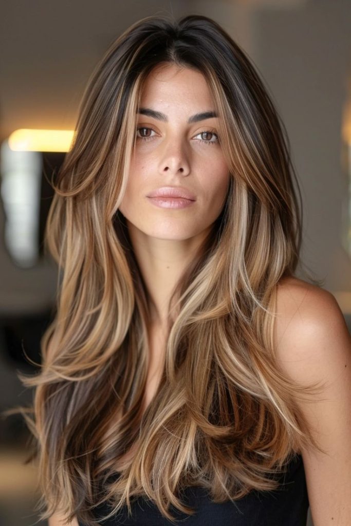 El balayage en tonos chocolate con destellos caramelo está en auge, ideal para morenas que desean añadir dimensión y calidez a su melena. Este estilo aporta un brillo elegante que resalta bajo la luz natural.