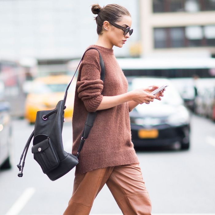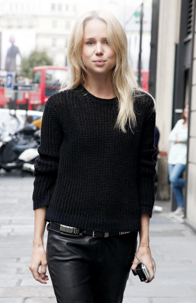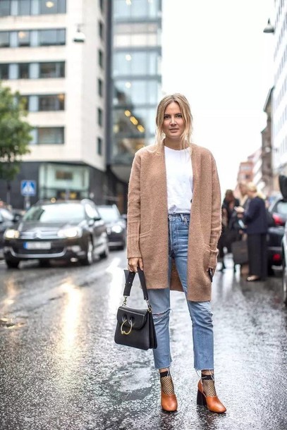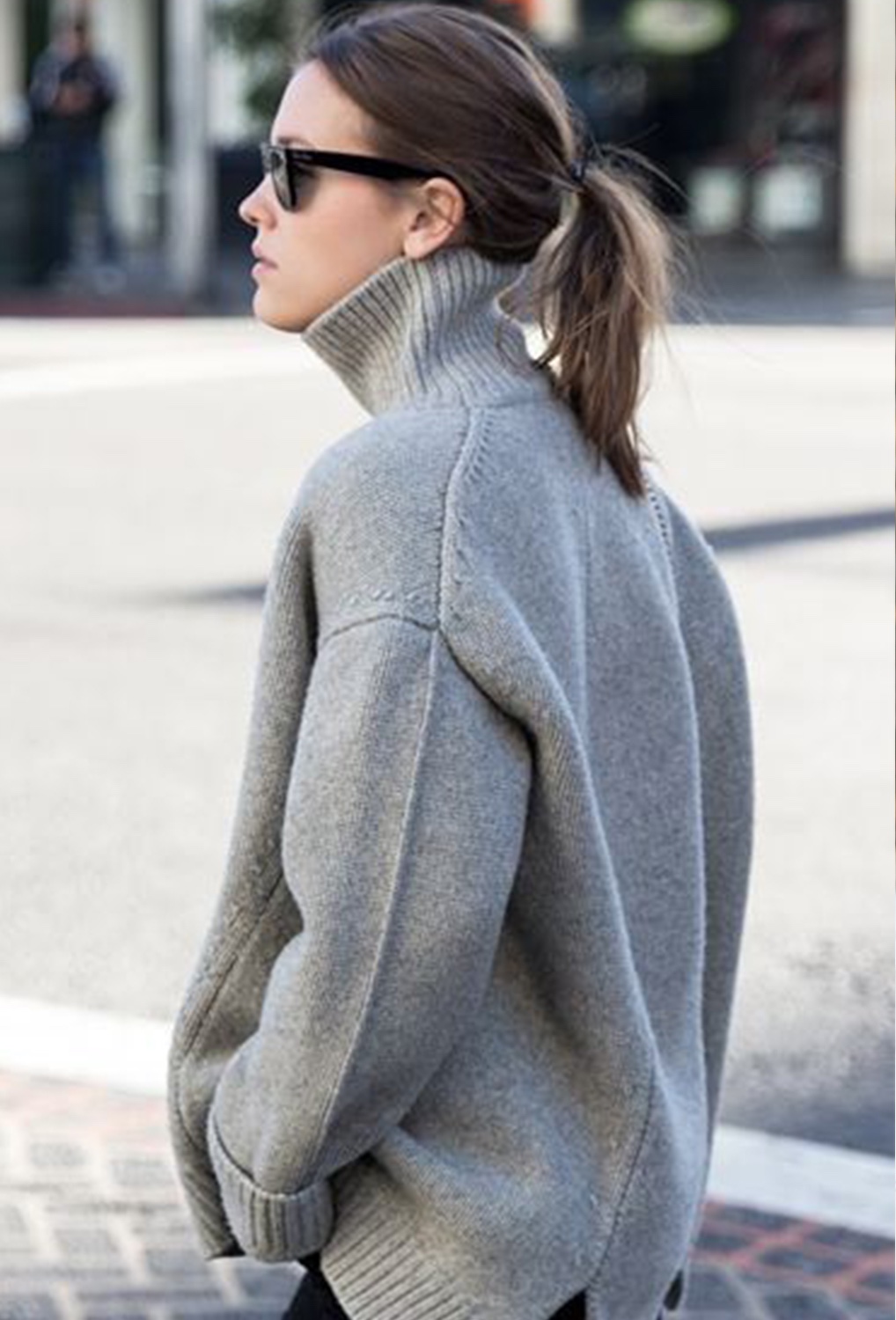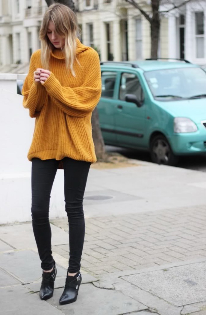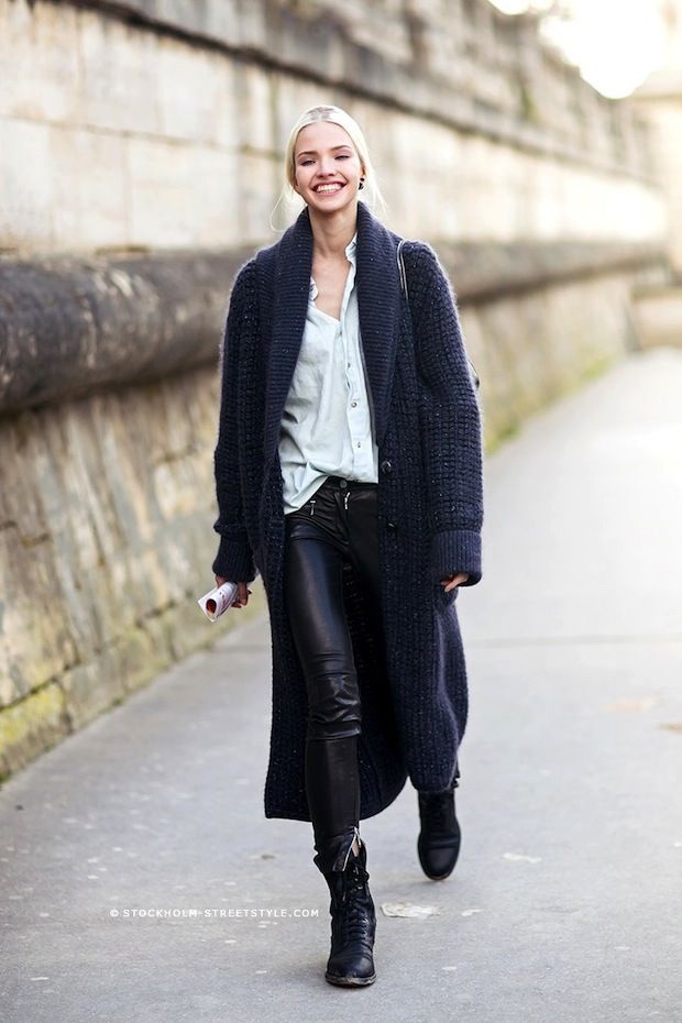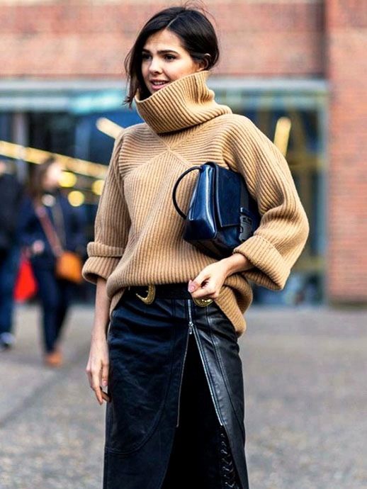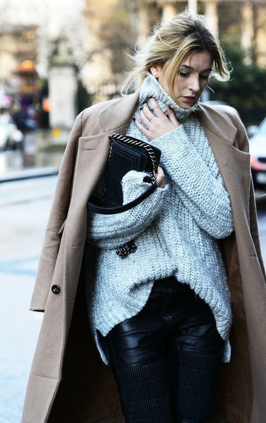 Me encanta esta mezcla de la foto de abajo: Abrigo camel + sweater oversized en gris + pantalón skinny de cuero. El resultado es fabuloso.