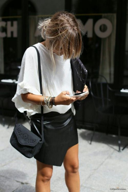 La combinación black & white es una propuesta que no falla y que te permitirá ajustar el estilo de tu mini de cuero para múltiples ocasiones. Para un look urbano y casual, llévala con un top básico y zapatillas o botines; y para un look más glam, una apuesta infalible es ‘elevar’ tu outfit con unos stilettos o sandalias de tacón.
