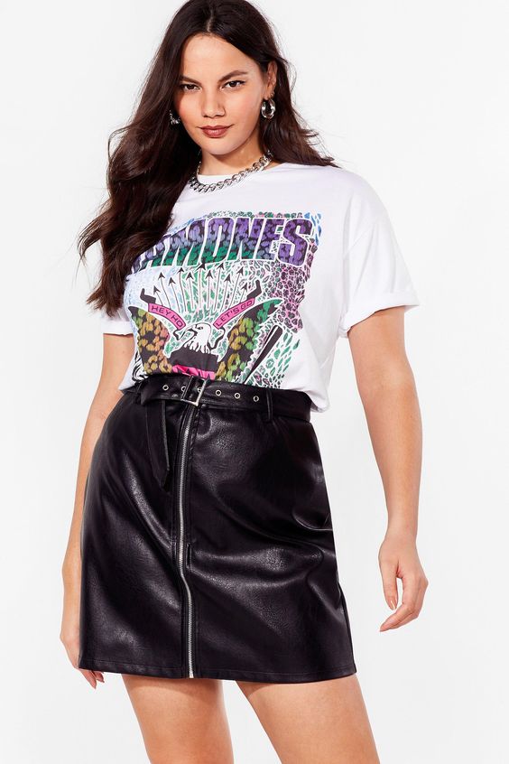 Para darle un aire roquero cargado de personalidad, las poleras gráficas serán las compañeras ideales de tu mini de cuero negra. Apuesta por modelos de calce más bien holgado, pero siempre recogidas, total o parcialmente, por el frente/lado de la cintura.