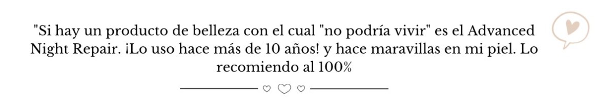 Advanced Night Repair es un suero que aprovecha el poder restaurador de la noche para ofrecer una renovación visible. Trabaja noche y día para ayudar a la piel a maximizar su ritmo natural de reparación y protección. Advanced Night Repair Repair Concentrate es un innovador tratamiento para la noche, con tecnología Chronolux ™ S.O.S. que rescata y restaura el aspecto de la piel rápidamente. Con Revitalizing Supreme+ luce una apariencia más firme, radiante y profundamente nutrida, por primera vez con efecto reafirmante. Termina la rutina con Advanced Night Repair Eye Supercharged Complex para una mirada renovada, con doble poder para combatir los efectos de los radicales libres, ayuda a reparar el impacto visible de la falta de sueño, la luz azul, reduce las líneas de expresión y las ojeras. Se ha demostrado que los ojos muestran un aspecto brillante y visiblemente despierto.