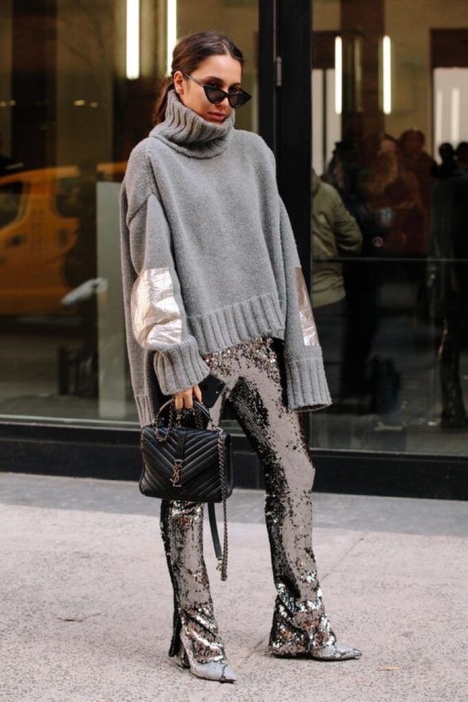 “Un sweater oversized en tonos neutros es nuestra propuesta favorita para darle un aire relajado a tus pantalones de lentejuelas sin usar zapatillas”