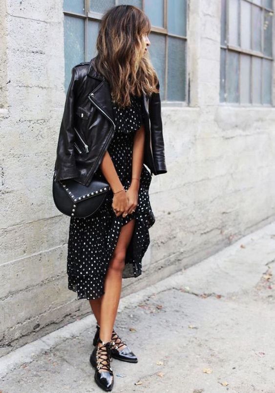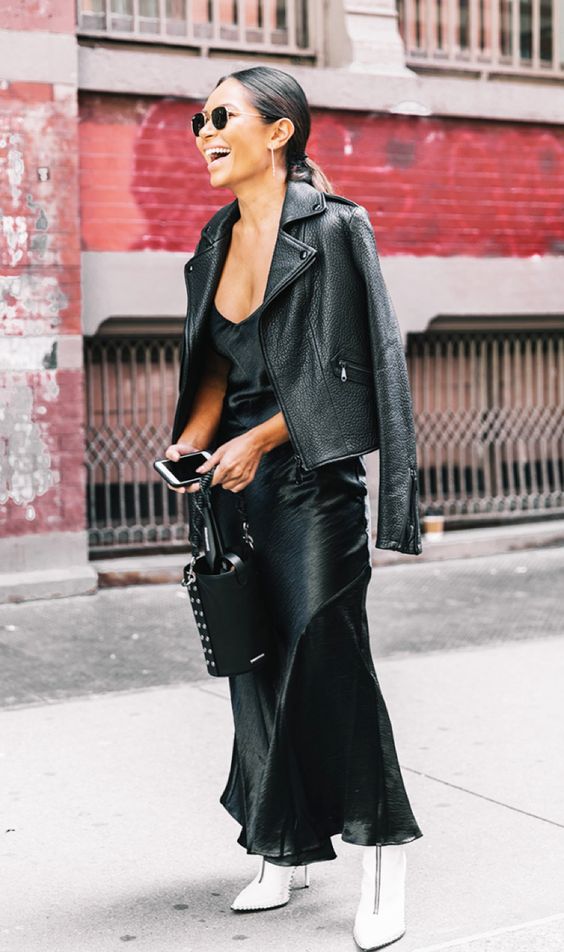 La clásica chaqueta de cuero (o eco-cuero) negra es una prenda que se queda en el clóset TODO el año. Esta primavera combínala con vestidos ligeros o faldas midi, y zapatillas urbanas crear un look casual y fresco.