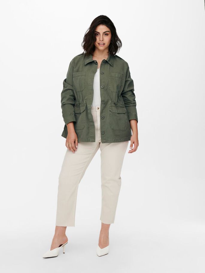 Este modelo de inspiración militar, de tela ligera, silueta recta y múltiples bolsillos, es perfecta para contrastar con prendas primaverales como vestidos, blusas y tops básicos.