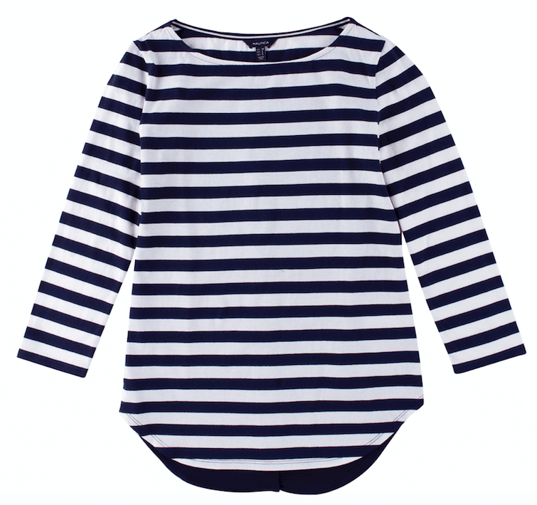 La clave es que la prenda no sea ajustada ni se pegue al abdomen para que así no vaya a quedar en evidencia algún “rollito” y las rayas se distorsionen en los pliegues.