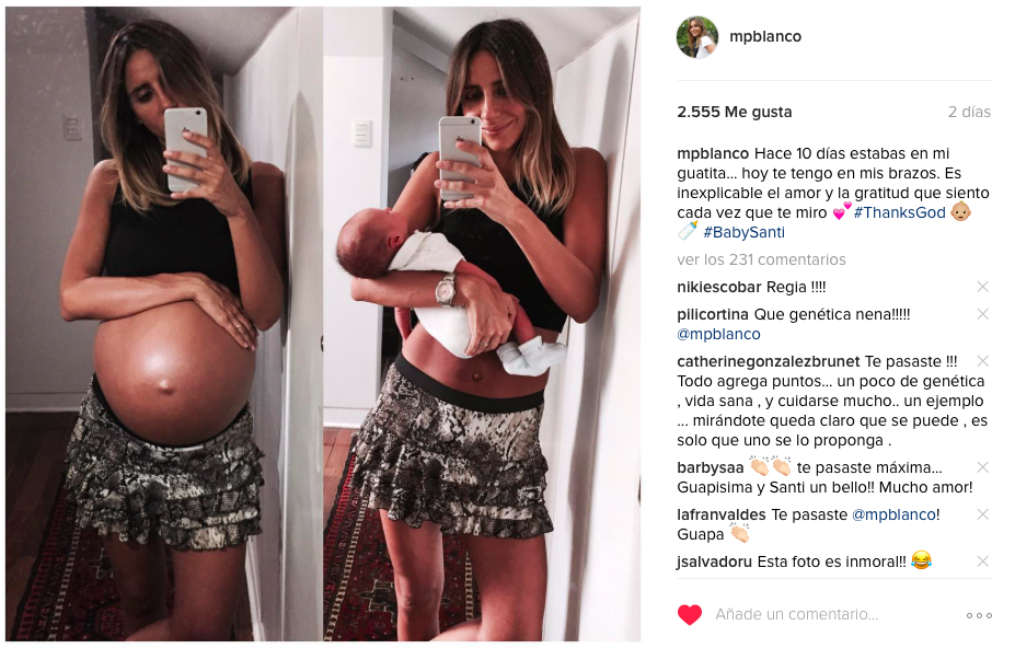 Primero, llevo muchos años haciendo ejercicio con mucha intensidad, así que mi musculatura está muy desarrollada. Como el cuerpo tiene “memoria”, aunque durante el embarazo haya bajado la intensidad de ejercicios y ahora no lo practico en absoluto por motivos obvios (estoy dedicada al 100% de los cuidados de mi hijo), los músculos han ayudado a recuperar con más facilidad la forma anterior del cuerpo. Yo quedé embarazada estando en forma, bien en mi peso y subí 9 kilos, por tanto me fue fácil volver a como estaba antes.