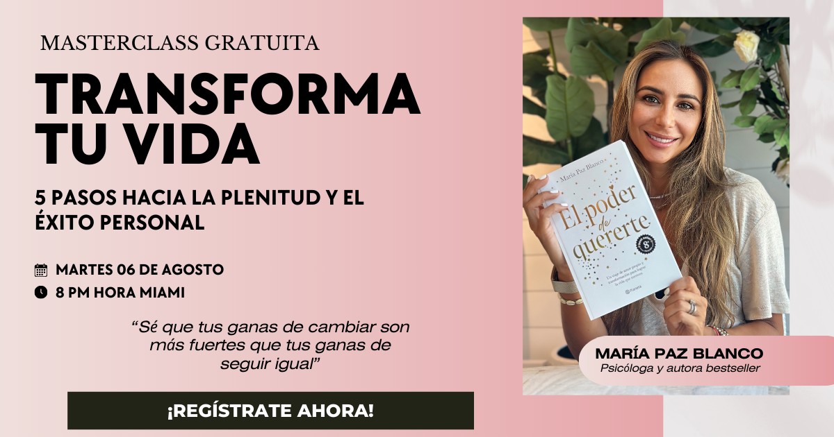 María Paz Blanco, reconocida Psicóloga y Coach de Vida, te invita a asistir el próximo Martes 6 de agosto a las 8PM Chile/Miami, a su exclusiva Masterclass en vivo, online y gratuita: “Transforma tu Vida: 5 pasos hacia la plenitud y el éxito personal”.