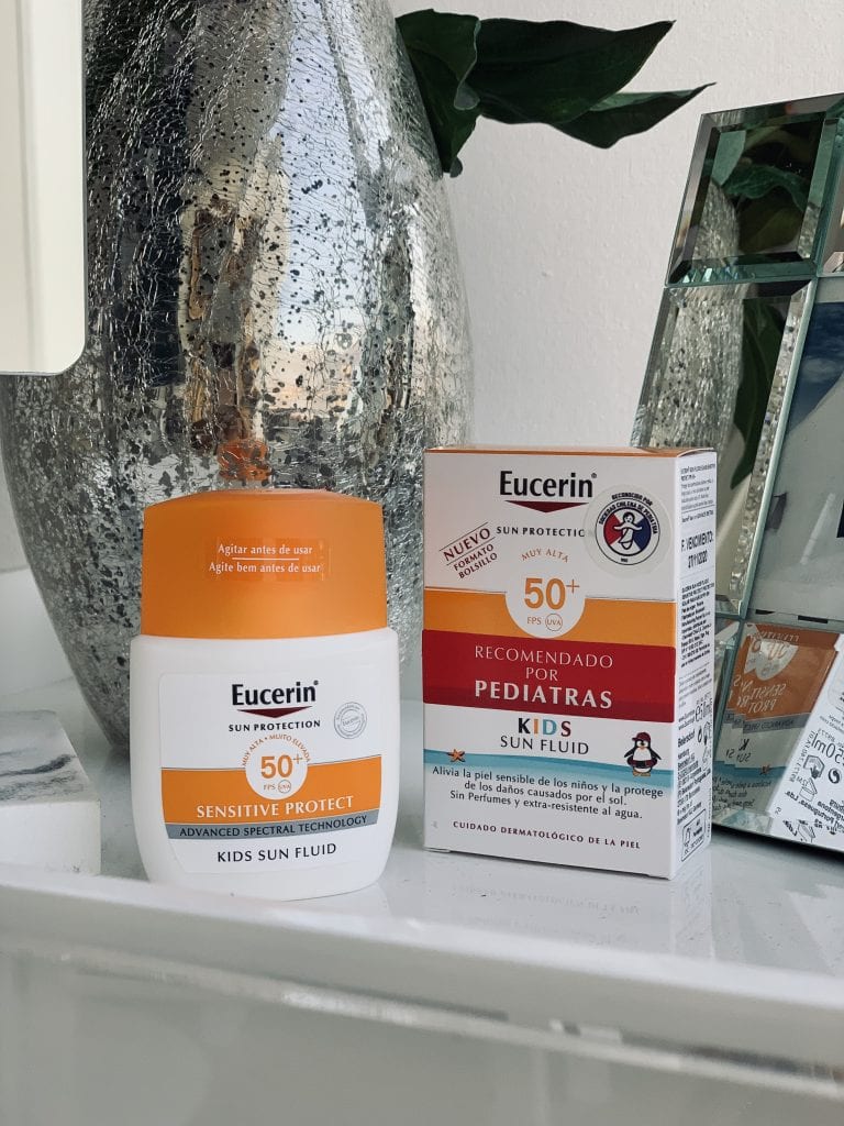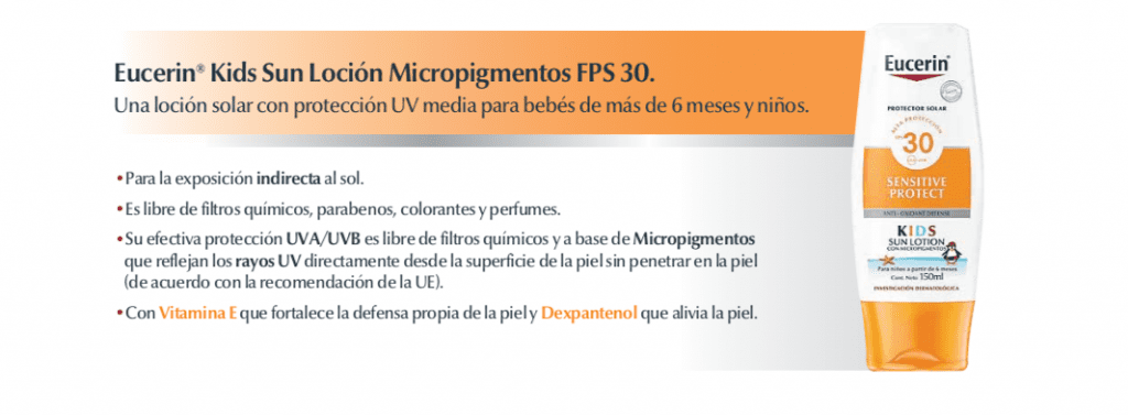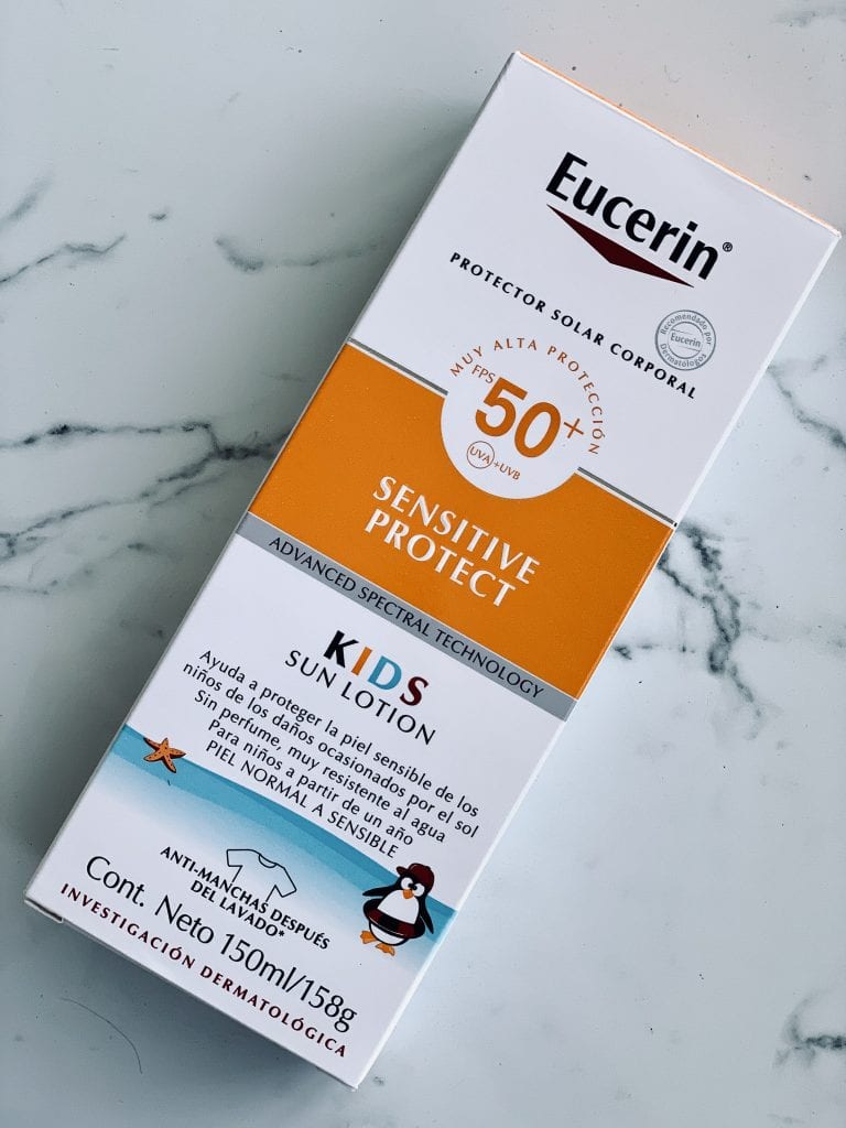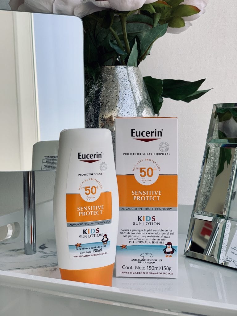 El Factor 50 Sensitive Protect Kids de Eucerin protector solar superior con filtros minerales, para bebés y niños. Protege la piel sensible de las quemaduras solares y de los daños inducidos por el sol.