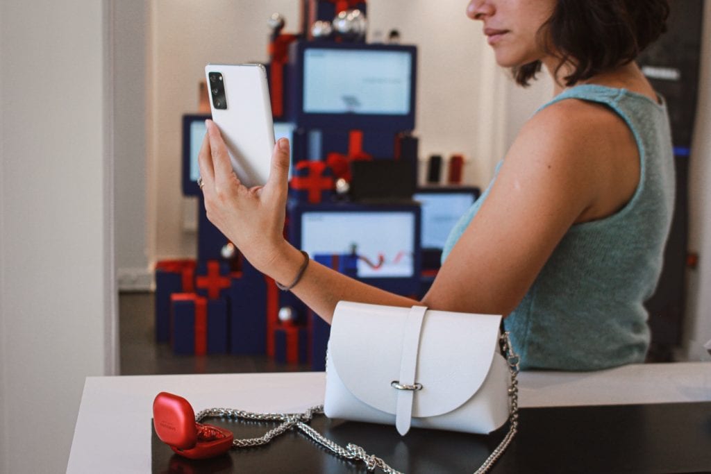 El Galaxy S20FE Cloud White corresponde a un color exclusivo de Samsung.com y en navidad te lo puedes llevar con una cartera Prüne de regalo[2]