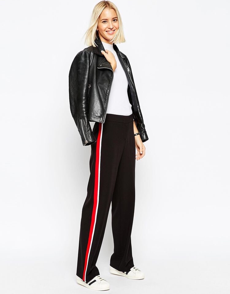 Estos pantalones holgados que se apoyan sobre la cadera o a media cintura, han hecho de su característica banda lateral, normalmente de color rojo o blanco, todo un uniforme en las amantes de las últimas tendencias.
