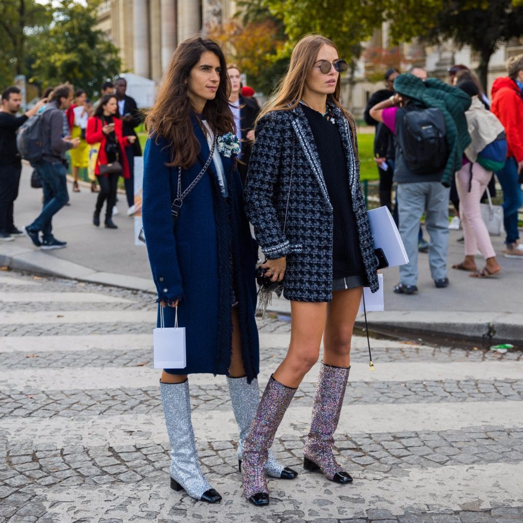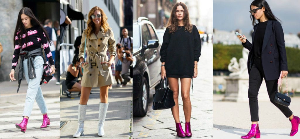 ¡Pasos que sacan chispas! Los botines con glitter o brillos llegan como un accesorio para atraer miradas. Las botas de Chanel se transformaron en un hit fashionista entre las influencers (de taco bajo y emulando a las botas de montar) son capaces de encandilar la mirada. J Crew, Oscar de la Renta, Saint Laurent (las botas que Kendall Jenner usó para ver un partido de básquetbol) y Marco de Vincenzo son algunas de las casas de moda que se han rendido a las texturas resplandecientes en sus zapatos. La clave para llevar bien un look así es combinarlo con prendas neutras y sencillas.