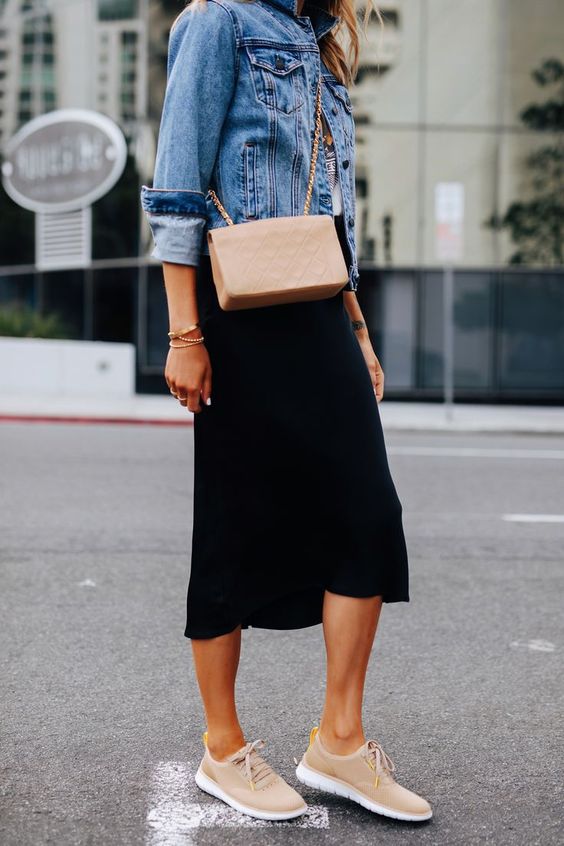 Sin duda es una de las combinaciones más atemporales que puedes lograr. Ambas piezas por sí sola (vestido negro y la chaqueta de jeans) son considerados “básicos del fondo de armario femenino” y juntas sin duda se potencian entre sí.