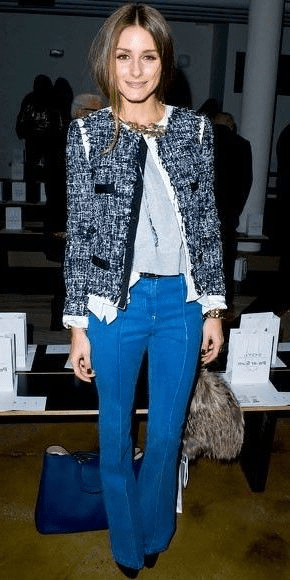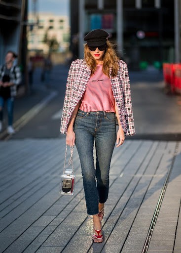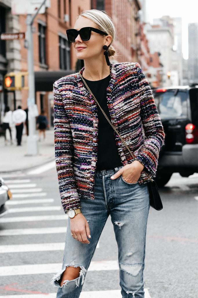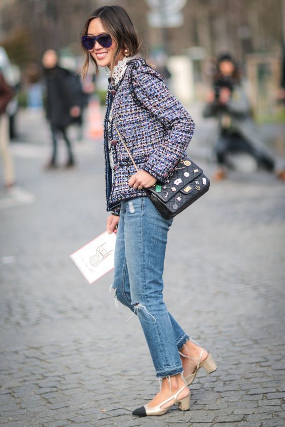 Para un look súper cómodo elige una chaqueta de tweed y unos vaqueros boyfriend desgastados azules. Zapatos de tacón son una opción perfecta para complementar tu atuendo y darle ese toque más “glam”.