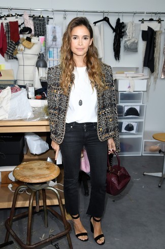 Opta por una chaqueta de tweed y unos vaqueros pitillo negros para conseguir una apariencia relajada pero chic.