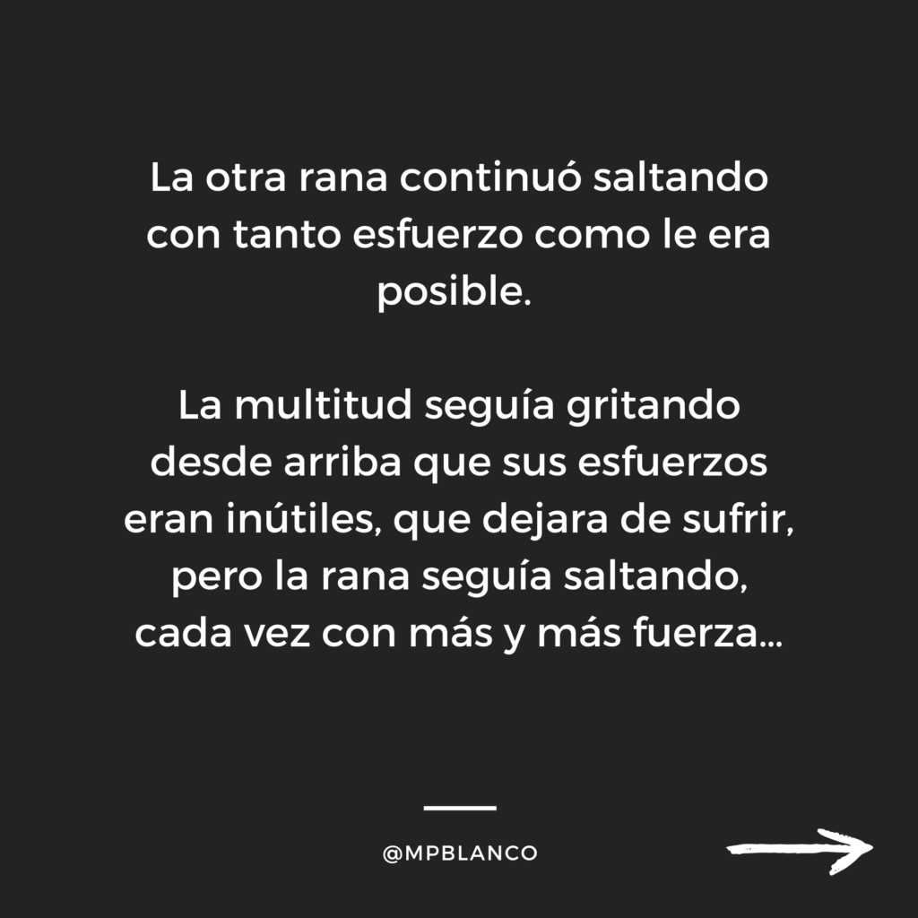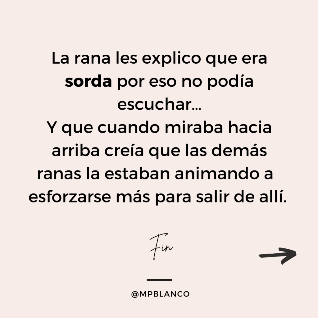Como la rana sorda, no permitas que los demás, ni tampoco tus propios miedos, consigan que dejes de luchar para superar los obstáculos de la vida. Y recuerda que con una palabra de aliento o simplemente prestando tu atención y tu apoyo, puedes ayudar a los que quieres a que superen los suyos.