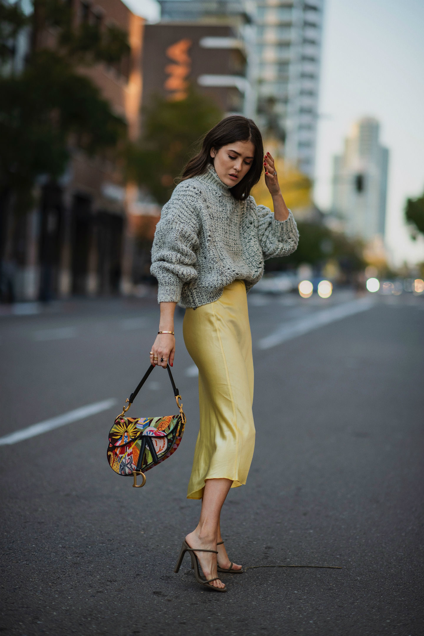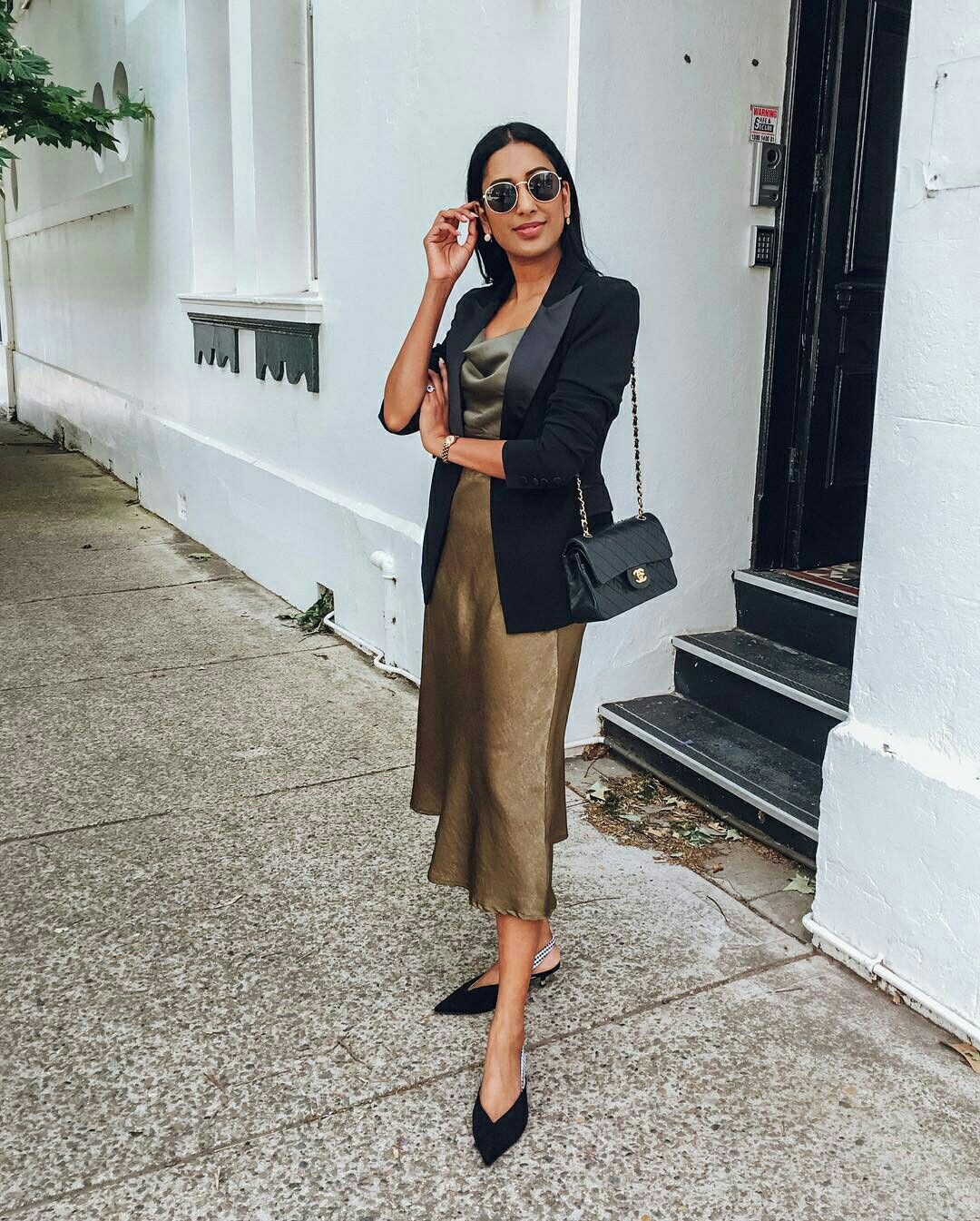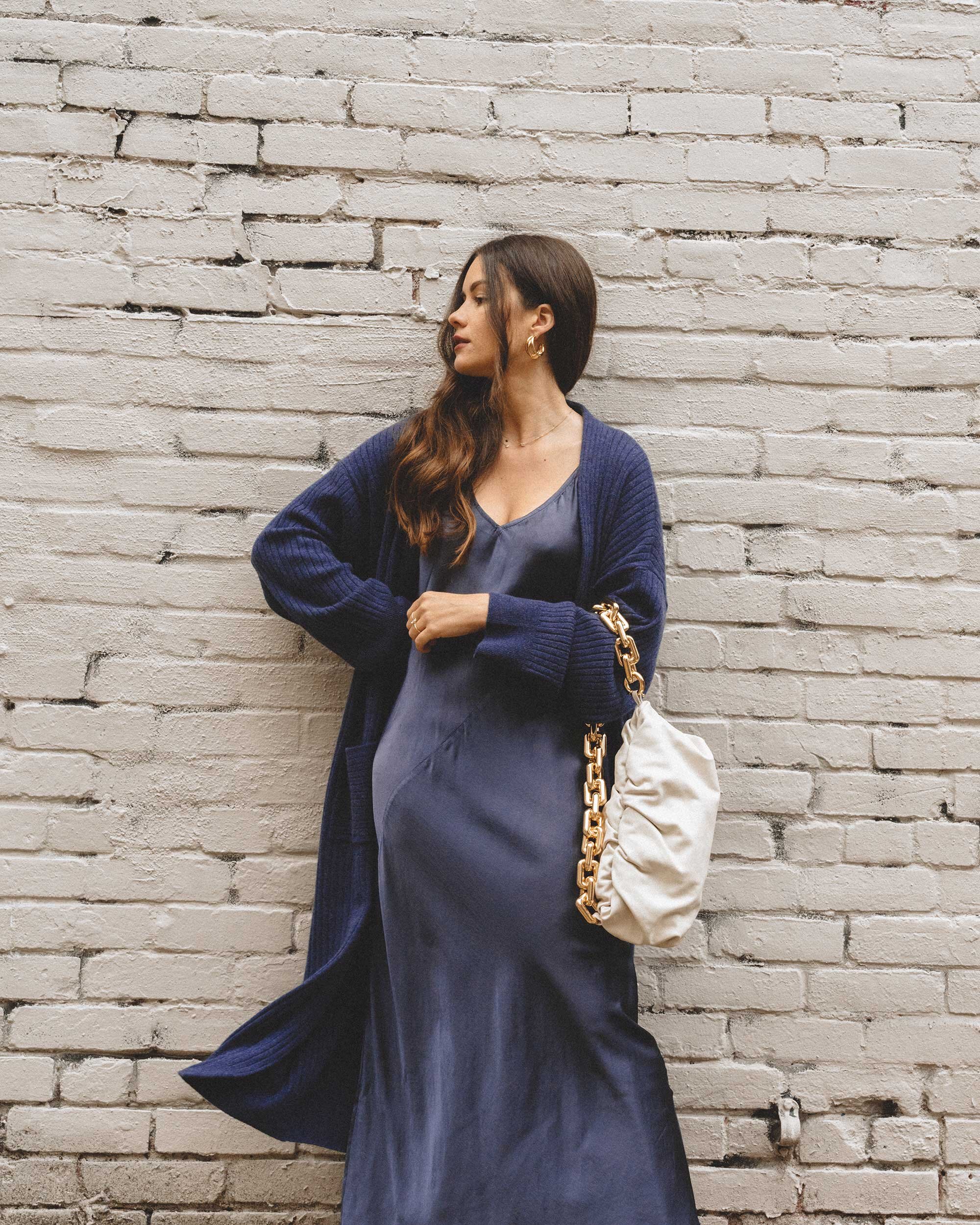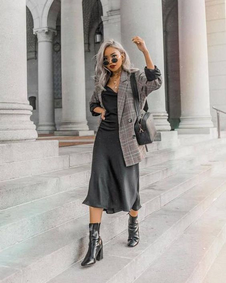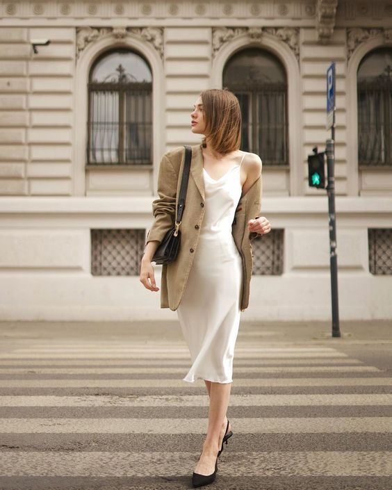 El querido vestido satinado ya no es solo para fiestas, úsalo a diario combinándolo con prendas entretenidas que restan un poco de elegancia.
