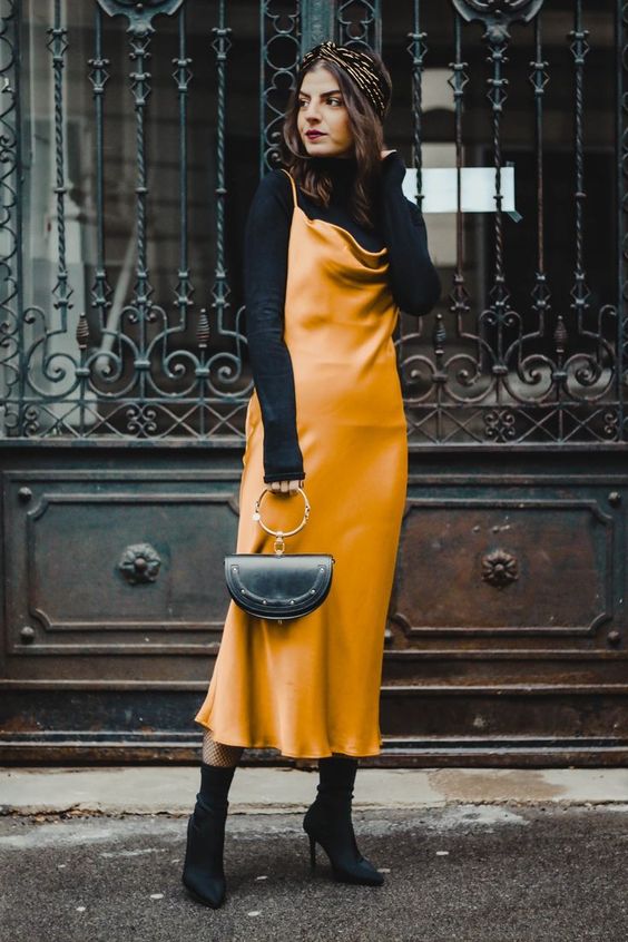 Las botas o botines con vestido satinado son una combinación que nos encanta y que puedes usar en todas las épocas del año. Elige un par en punta para alargar tus piernas o un diseño vaquero que siempre queda bien con vestidos. Pincha la galería para ver nuestra selección de looks inspiradores,